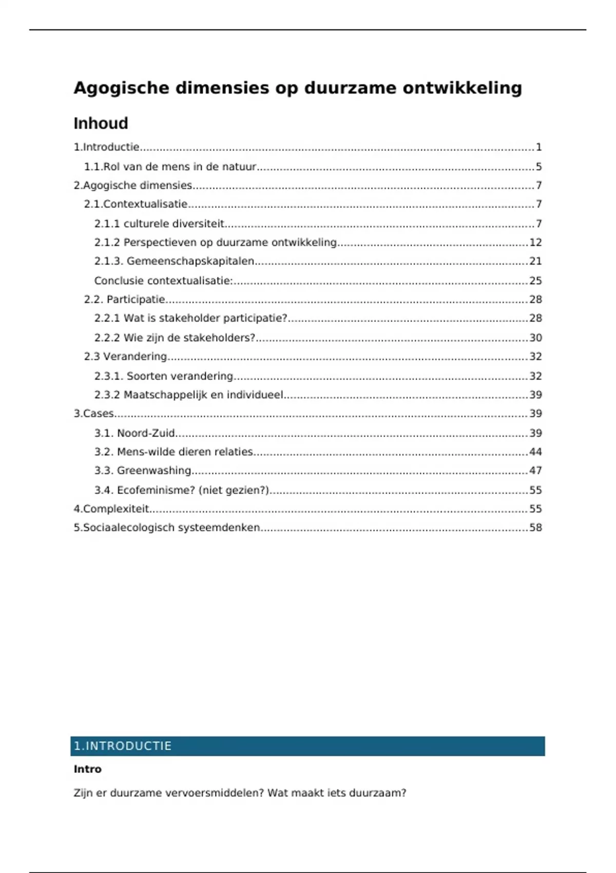 Hierbij een samenvatting van het vak agogische dimensies van duurzame ontwikkeling. In de samenvatting van de lesnotities vind je ook beknopte samenvattingen van 'culturele diversiteit', een hoofdstuk van Kohei Saito en 'greenwashing' terug.
