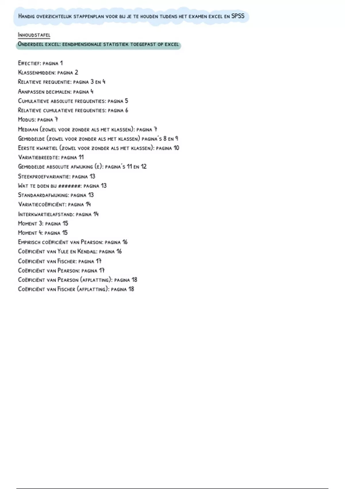 Stappenplan van excel en SPSS. Vooraan staat een inhoudstafel wat erg handig is om snel te zoeken. Het is erg overzichtelijk: Alle commando's excel staan aangeduid in het blauw Alles wat je moet aanduiden staat omcirkelt Ik heb deze meegenomen naar het examen en behaalde 18/20 (2,5/3 onderdeel excel en 15,5/17 onderdeel SPSS)