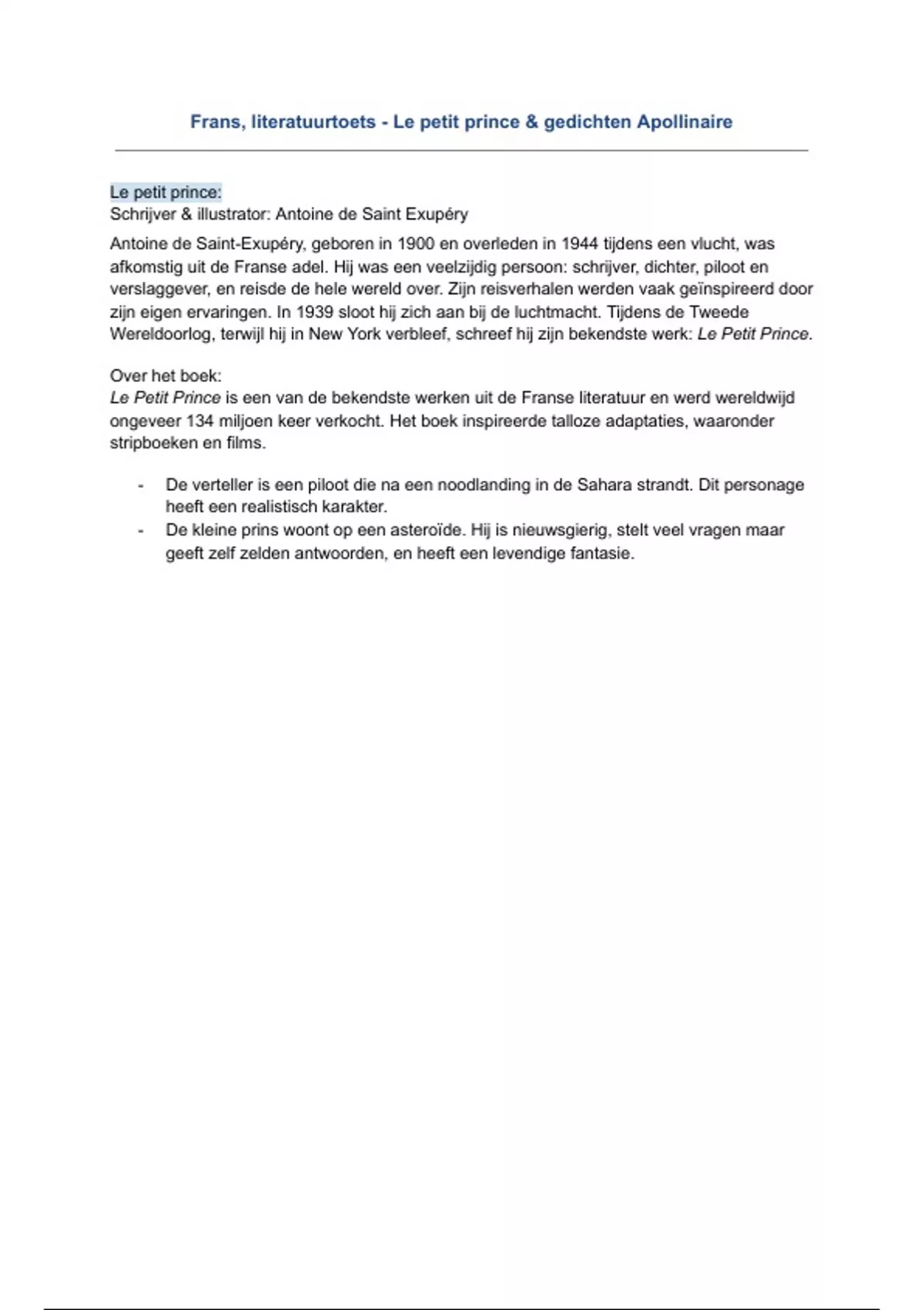 Frans, literatuurtoets - Le petit prince & gedichten Apollinaire