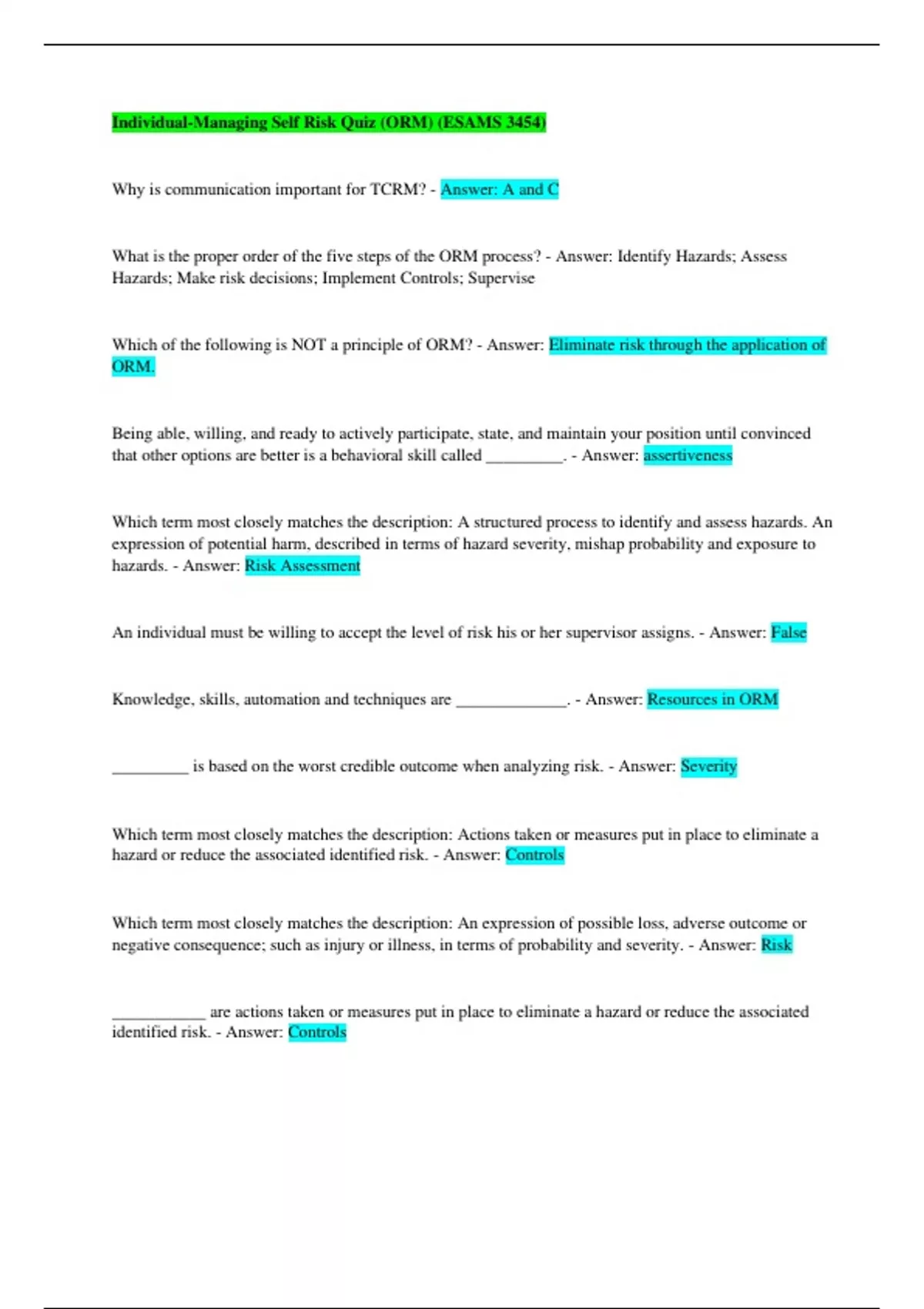 What is the proper order of the five steps of the ORM process? - Answer: Identify Hazards; Assess
