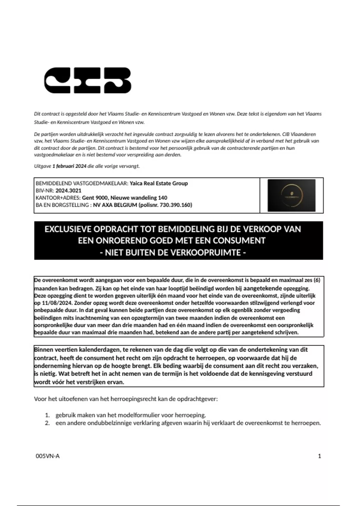 EXCLUSIEVE OPDRACHT TOT BEMIDDELING BIJ DE VERKOOP VAN