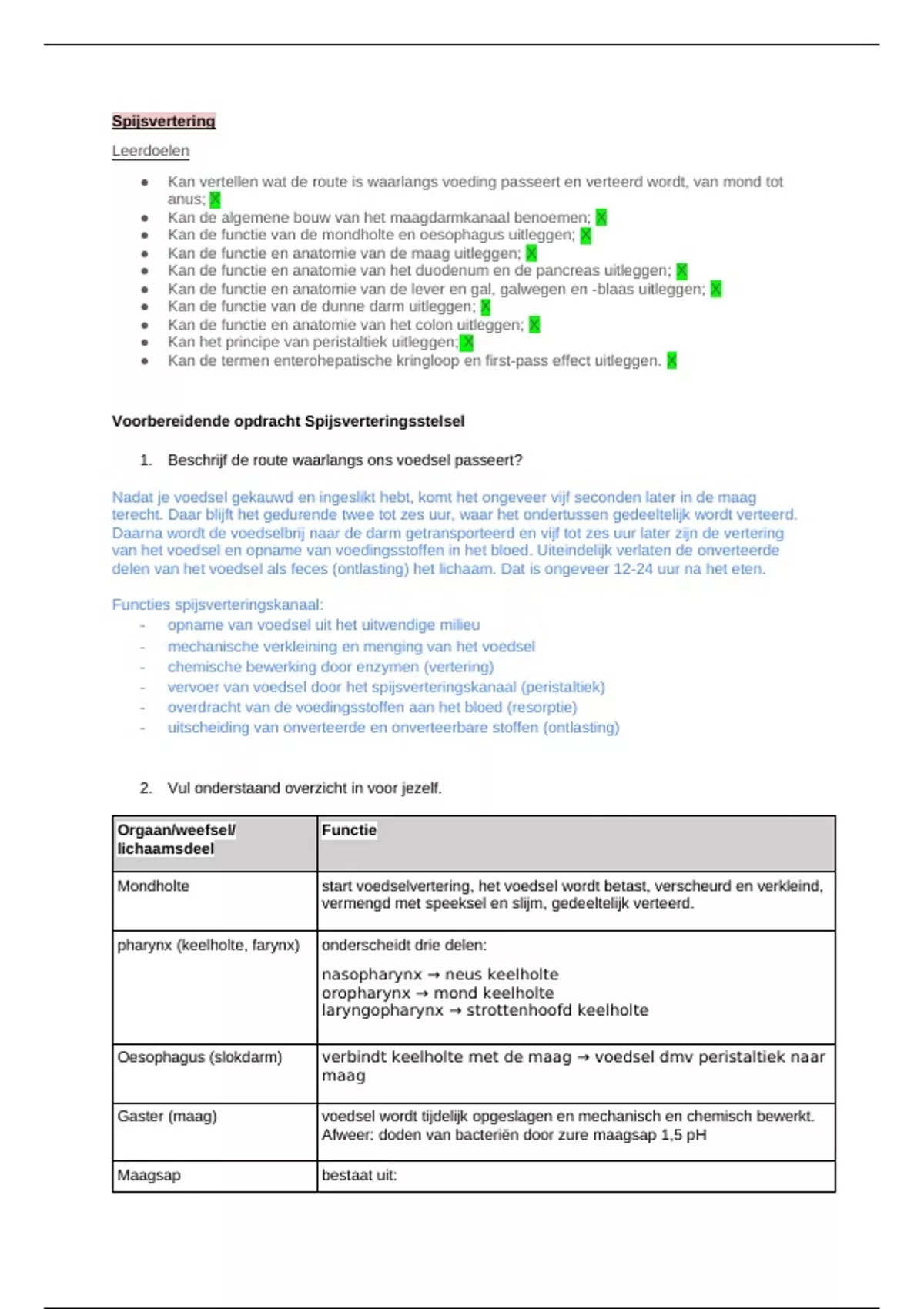 ● Kan de functie en anatomie van de maag uitleggen; X