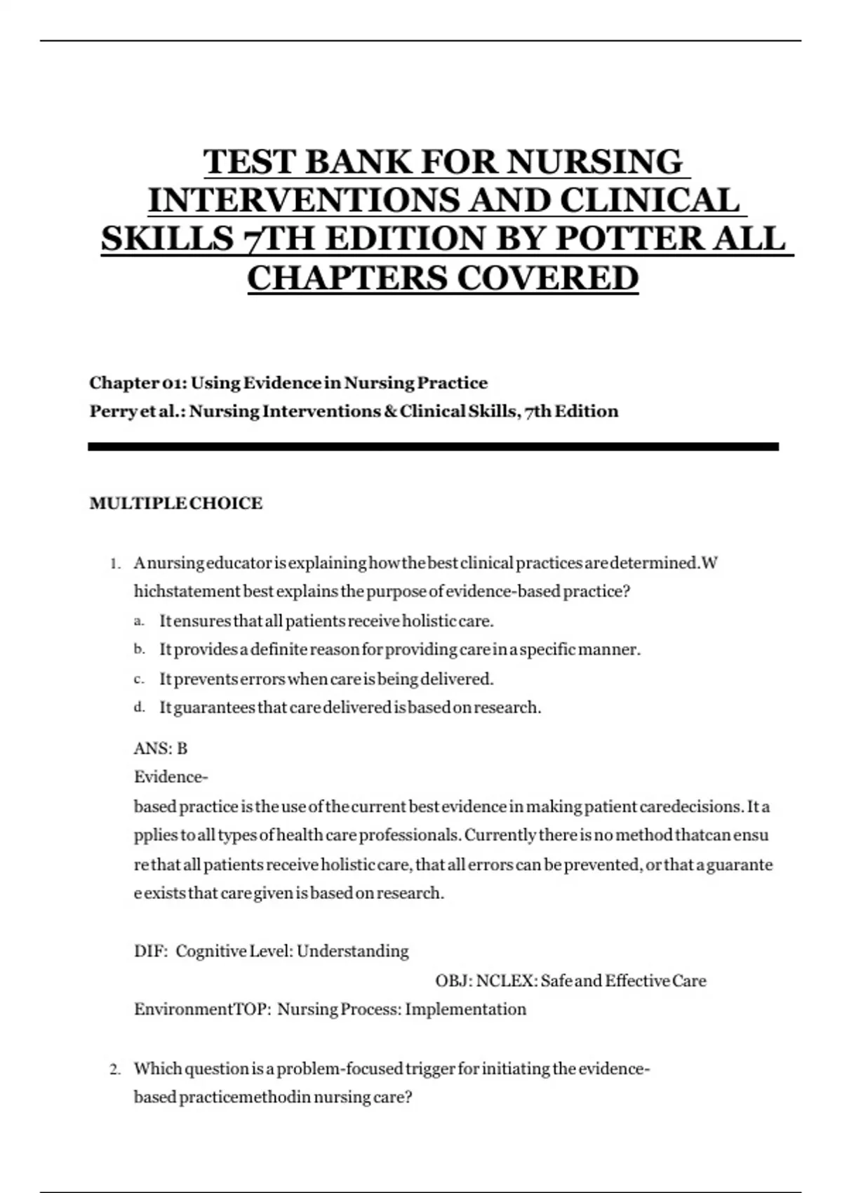 Nursing Interventions And Clinical Skills 7th Edition By Potter Test Bank Chapter 01: Using Evidence in Nursing Practice Perry et al.: Nursing Interventions & Clinical Skills, 7th Edition MULTIPLE CHOICE 1. A nursing educator is explaining how the best clinical practices are determined. Whichstatement best explains the purpose of evidence-based practice? a. It ensures that all patients receive holistic care. b. It provides a definite reason for providing care in a specific manner. c. It prevents errors when care is being delivered. d. It guarantees that care delivered is based on research. ANS: B Evidence-based practice is the use of the current best evidence in making patient care decisions. It applies to all types of health care professionals. Currently there is no method thatcan ensure that all patients receive holistic care, that all errors can be prevented, or that a guarantee exists that care given is based on research. DIF: Cognitive Level: Understanding OBJ: NCLEX: Safe and Effective Care EnvironmentTOP: Nursing Process: Implementation 2. Which question is a problem-focused trigger for initiating the evidence-based practice methodin nursing care? a. What is known about reduction of urinary tract infections in the older adult withdiabetes? b. How can chronic pain best be described when the patient is nonverbal? c. How long can an IV catheter remain in place in a patient with obesity? d. What measures can the nurse take to reduce the rising incidence of urinary tractinfections on the older adult care unit? ANS: D Evidence-based practice (EBP) questions tend to arise from two sources: recurrent problemsor new knowledge. In the correct option, the increase in urinary tract infections indicates a trend or recurring problem in a specific group of patients. The other questions are general information questions, not based on what is happening in a specific area or to a group of specific patients in an area or relating to an observed trend. DIF: Cognitive Level: Applying OBJ: NCLEX: Safe and Effective Care EnvironmentTOP: Nursing Process: Implementation 3. What does the “I” indicate in a “PICO” question? a. Intervention of interest b. Incorporation of concepts c. Implementation by nursing d. Interest of personnel ANS: A The “I” stands for intervention of interest, meaning what the nurse hopes to use in practice and believes is worthwhile or valuable. This could be a treatment for a specific type of woundor an approach on how to teach food preparation for a patient with impaired sight.