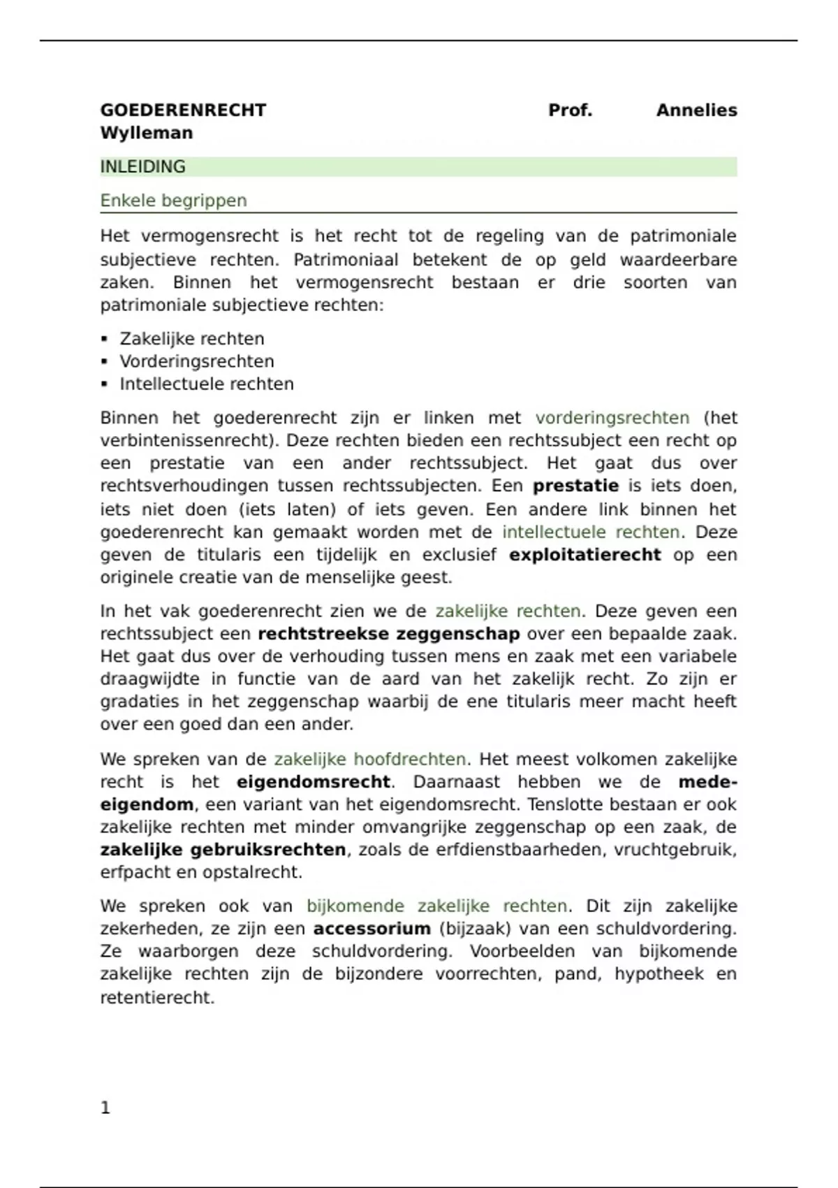 Samenvatting van het vak goederenrecht gegeven door prof. Annelies Wylleman in het tweede semester. De samenvatting is gemaakt op basis van de slides, mijn notities en het boek. Ik volgde alle lessen.