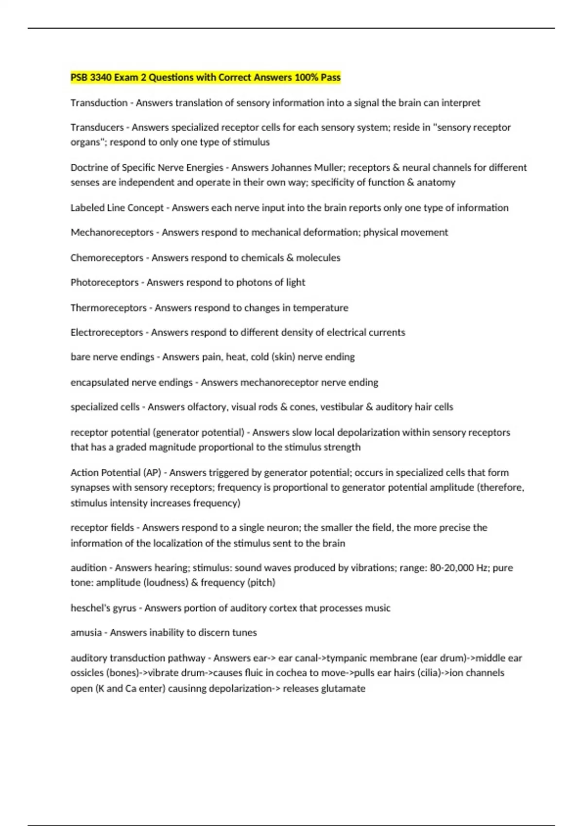 PSB 3340 Exam 2 Questions with Correct Answers 100% Pass Transduction - Answers translation of sensory information into a signal the brain can interpret Transducers - Answers specialized receptor cells for each sensory system; reside in "sensory receptor organs"; respond to only one type of stimulus Doctrine of Specific Nerve Energies - Answers Johannes Muller; receptors & neural channels for different senses are independent and operate in their own way; specificity of function & anatomy Labeled Line Concept - Answers each nerve input into the brain reports only one type of information Mechanoreceptors - Answers respond to mechanical deformation; physical movement Chemoreceptors - Answers respond to chemicals & molecules Photoreceptors - Answers respond to photons of light Thermoreceptors - Answers respond to changes in temperature Electroreceptors - Answers respond to different density of electrical currents bare nerve endings - Answers pain, heat, cold (skin) nerve ending encapsulated nerve endings - Answers mechanoreceptor nerve ending specialized cells - Answers olfactory, visual rods & cones, vestibular & auditory hair cells receptor potential (generator potential) - Answers slow local depolarization within sensory receptors that has a graded magnitude proportional to the stimulus strength Action Potential (AP) - Answers triggered by generator potential; occurs in specialized cells that form synapses with sensory receptors; frequency is proportional to generator potential amplitude (therefore, stimulus intensity increases frequency) receptor fields - Answers respond to a single neuron; the smaller the field, the more precise the information of the localization of the stimulus sent to the brain audition - Answers hearing; stimulus: sound waves produced by vibrations; range: 80-20,000 Hz; pure tone: amplitude (loudness) & frequency (pitch) heschel's gyrus - Answers portion of auditory cortex that processes music amusia - Answers inability to discern tunes auditory transduction pathway - Answers ear-> ear canal->tympanic membrane (ear drum)->middle ear ossicles (bones)->vibrate drum->causes fluic in cochea to move->pulls ear hairs (cilia)->ion channels open (K and Ca enter) causinng depolarization-> releases glutamate cochlear nerve - Answers auditory nerve made up of bipolar axons binaural hearing - Answers disparities bewteen ears that help locate sound's point of origin conduction deafness - Answers deafness from middle ear problem sensorineural deafness - Answers deafness from loss of hair or nerve central deafness - Answers deafness from cortex problems vestibular system - Answers movement of head moves vestibular hair cells, which helps provide balance & fluidity in your field of vision (cochlea, vestibular sacs: saccule & utricile),semicircular canals) Gustation (taste) - Answers uses taste receptors in taste buds/ papillae (20-50 receptors per bud, 10,000 buds) Olfaction (smell) - Answers uses olfactory receptors (40 million) in epithellium to sense volatile substances in 15-300 molecular weight range olfactory receptors - Answers have action potentials when oderants bind to due to influx of positive ions (mainly Na) Oderant Receptors - Answers 350 functional types; axons go to olfactory bulb (glomerulus & mitral cell) @ the base of the brain vision - Answers uses photoreceptors (cone & rods) to transduce photons of light (380nm-760 nm) into action potentials in the brain rods - Answers low intensity light; distibuted widely; high convergence of information helps increase the probabilty of an AP in low light conditions cones - Answers high intensity light; sensitive to different wavelengths (color vision & high acuity vision) fovea - Answers area in back of eye where light reaches cones without passing through blood vessels or tissue; contains ONLY cones & the most acute vision; little convergence = direct line of info blind spot - Answers where blood vessels exit the eye; no photoreceptors photopigments - Answers opsin and retinal molecules embedded within visual transduction membrane; G-protein coupled (Gt) opsin - Answers protein dye that forms complex with retinal (complex called Gt/ transduc