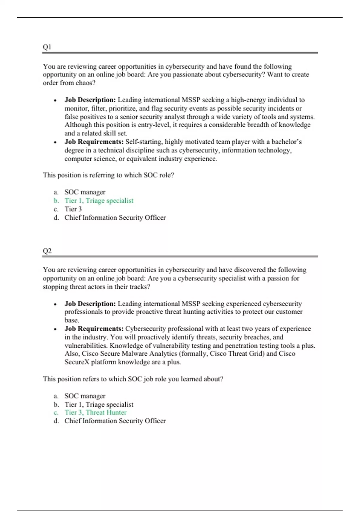 You are reviewing career opportunities in cybersecurity and have found the following