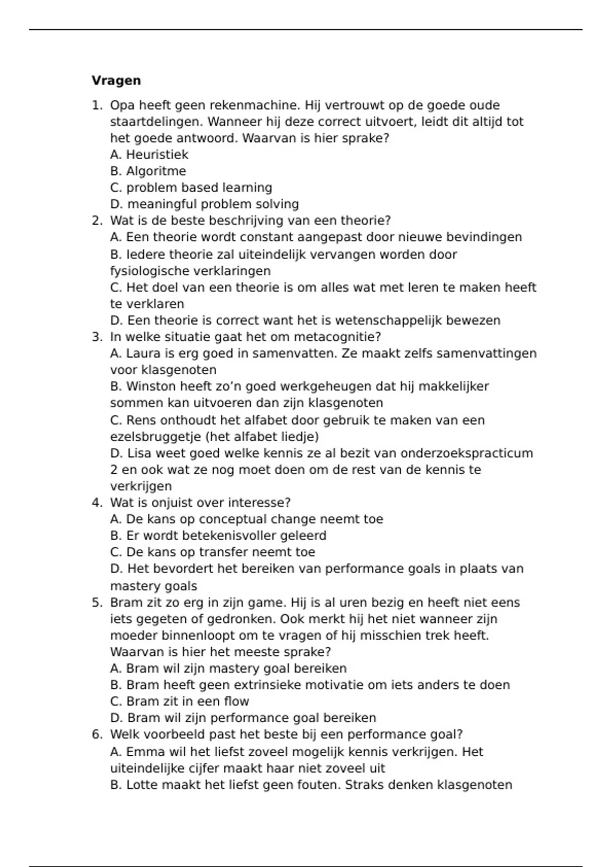 Dit is een oefentoets voor het vak leren en cognitie (inclusief oud tentamenvragen!). Het zijn 20 vragen inclusief antwoorden. Ik heb hiermee het tentamen afgerond met een 7,9