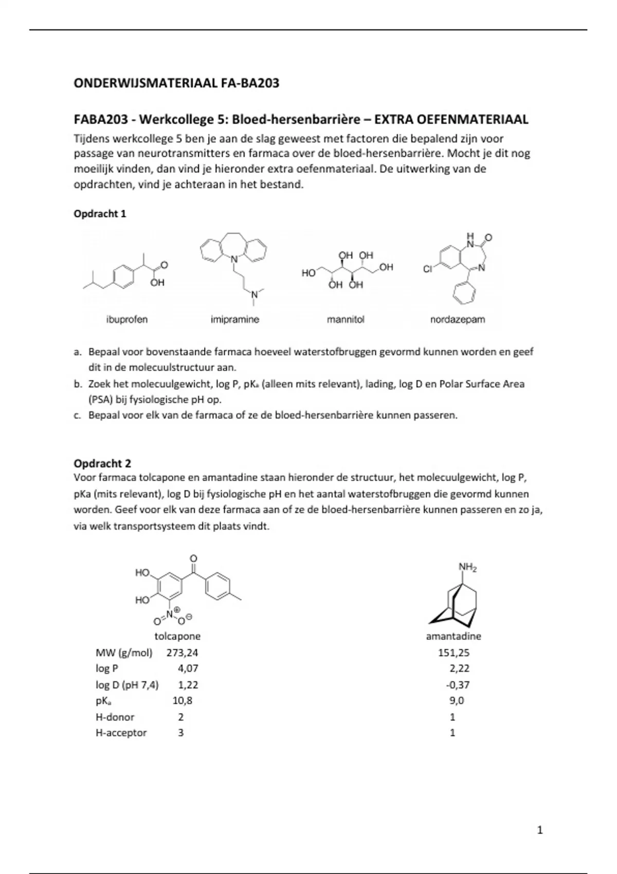 FABA203 - Werkcollege 5: Bloed-hersenbarrière – EXTRA OEFENMATERIAAL