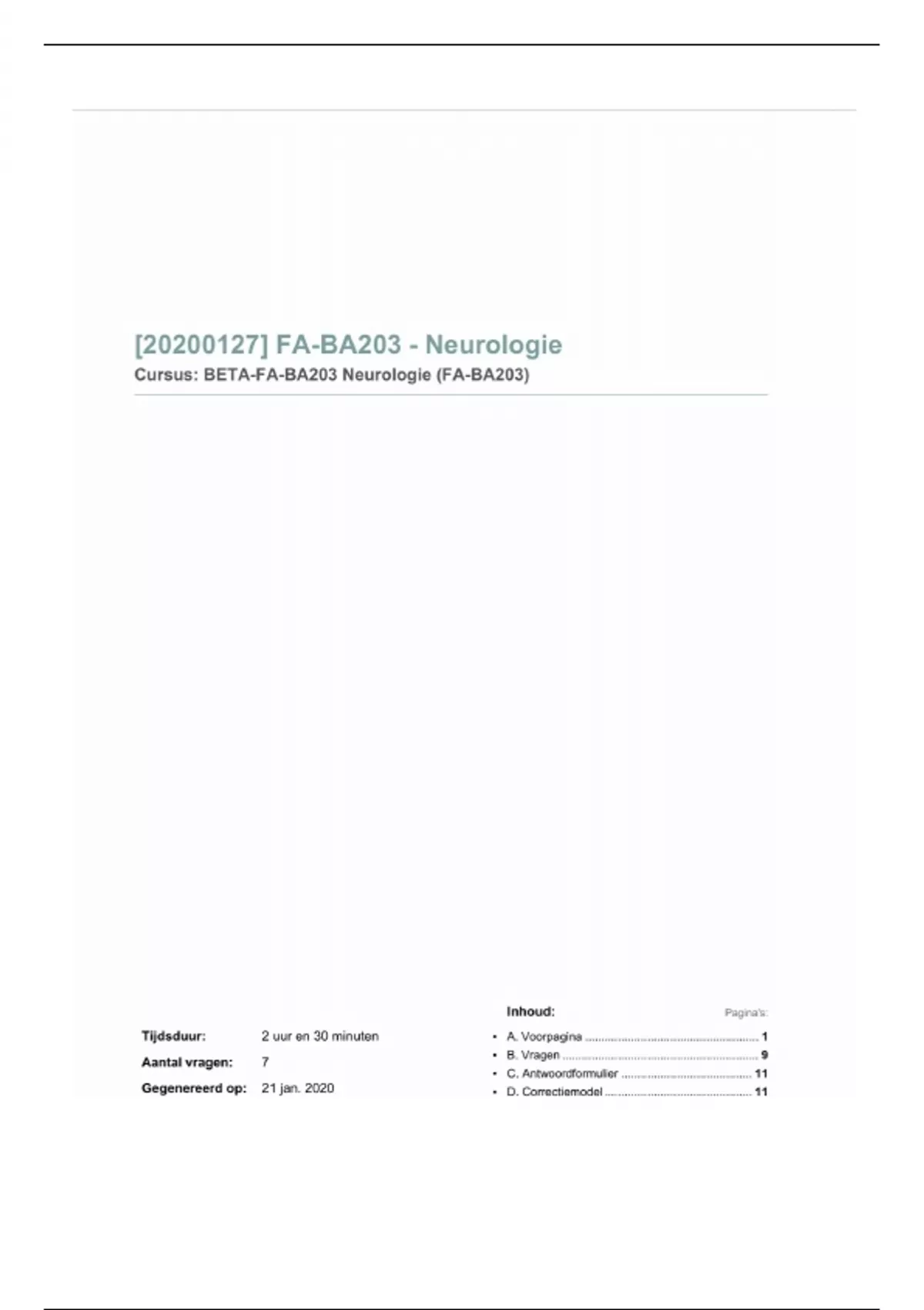 Samenvatting FA-BA203 Oefentoets neurologie incl uitwerkingen + bijlage