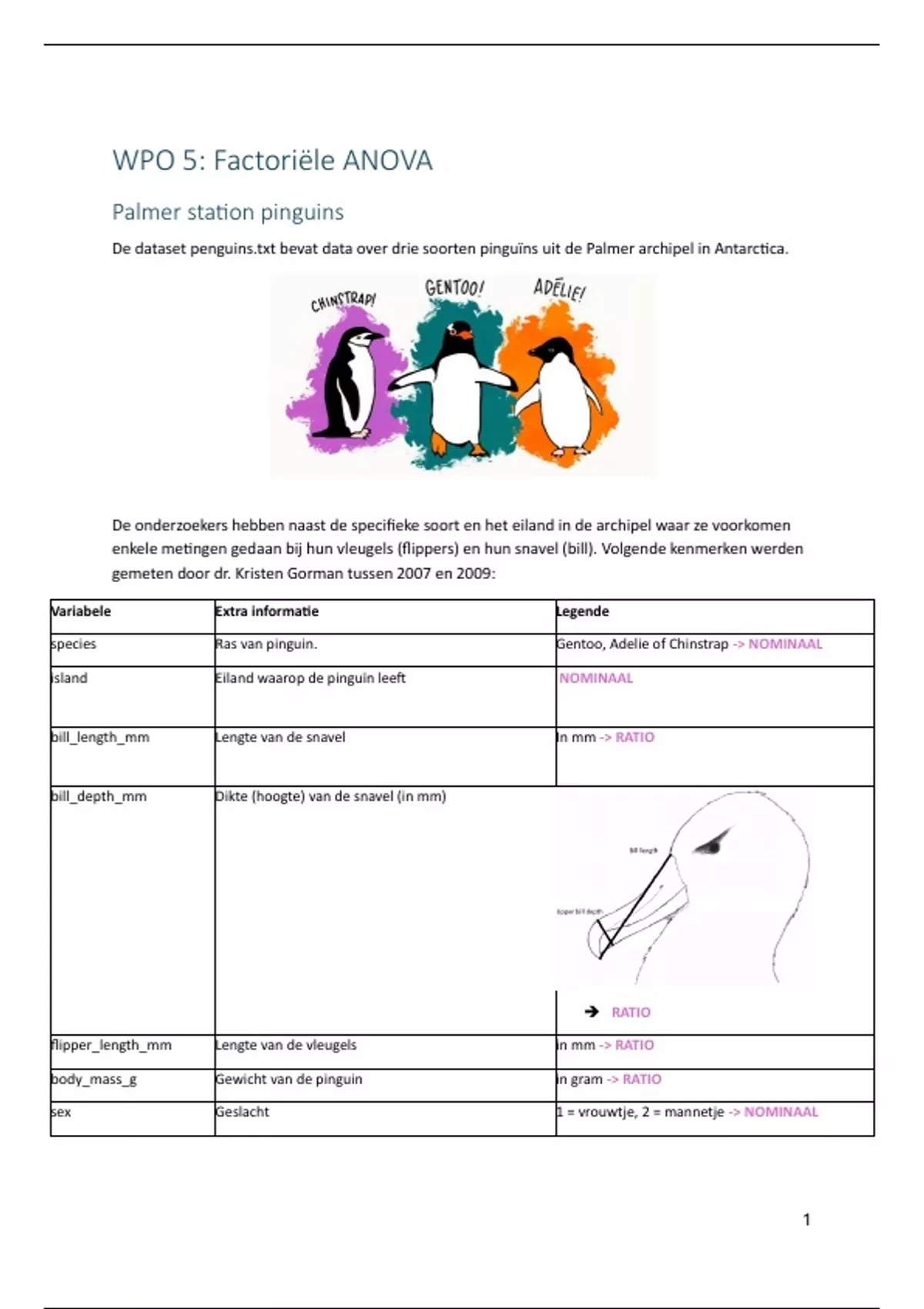 De dataset penguins.txt bevat data over drie soorten pinguïns uit de Palmer archipel in Antarctica.