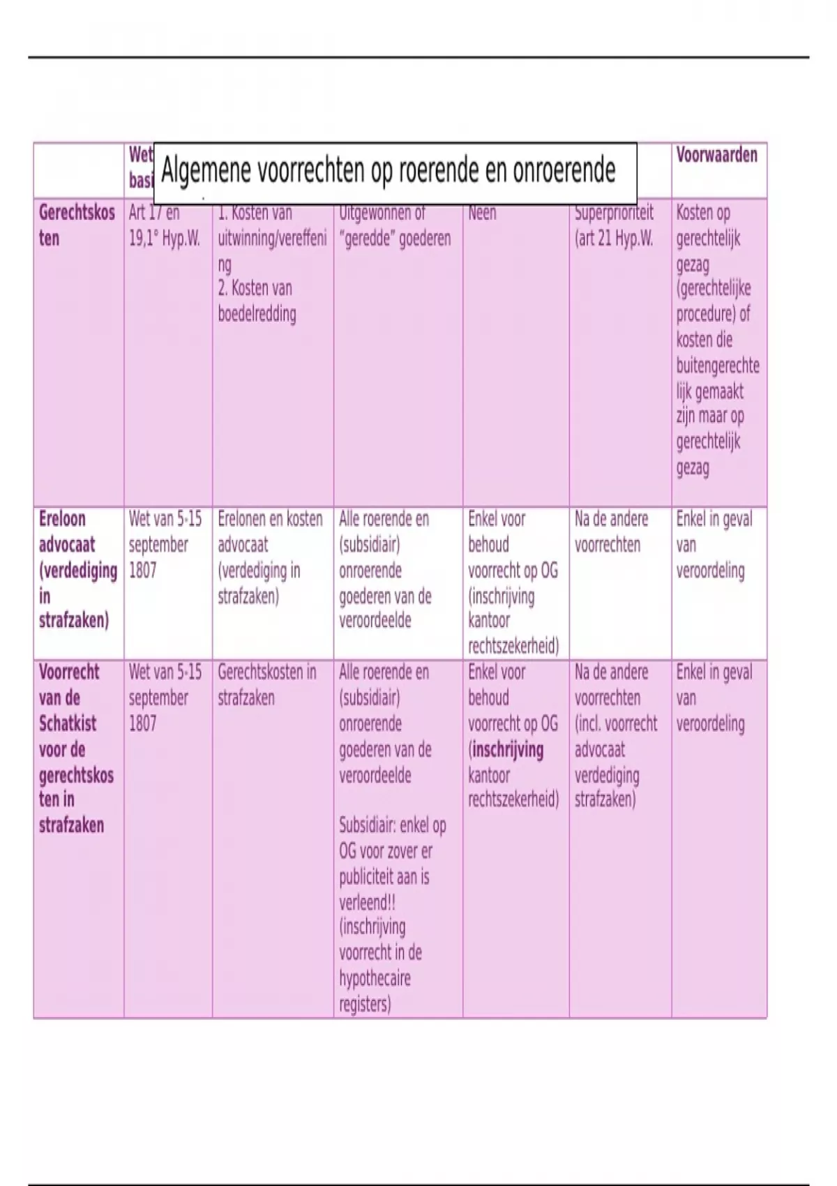 Dit is een super handige tabel van alle voorrechten die we tijdens de les hebben gezien. Ik heb de wettelijke basis, gewaarborgde schuldvordering, onderpand, publiciteit, rang en voorwaarden in de tabel verwerkt. Handig als je een overzicht wilt om te studeren of naast je te leggen tijdens het oefenen op een grote casus.