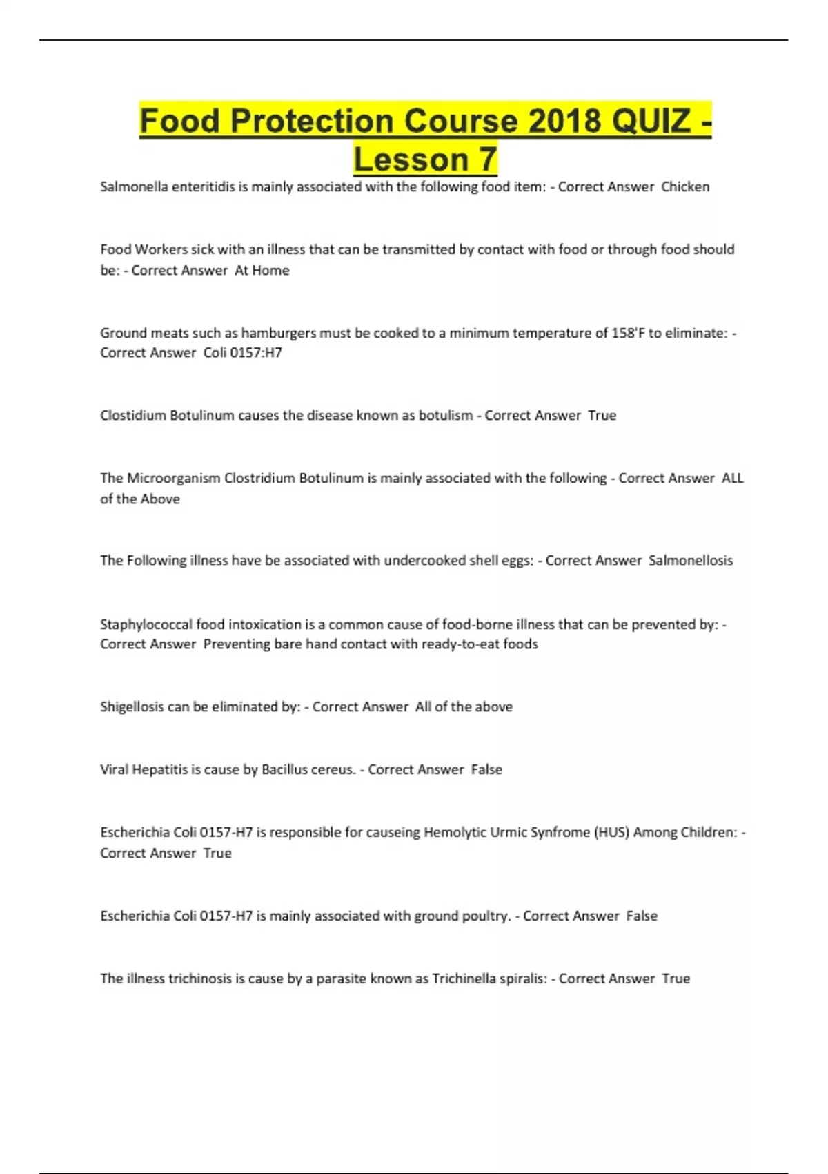Food Protection Course 2018 QUIZ - Lesson 7 Salmonella enteritidis is mainly associated with the following food item: - Correct Answer Chicken Food Workers sick with an illness that can be transmitted by contact with food or through food should be: - Correct Answer At Home Ground meats such as hamburgers must be cooked to a minimum temperature of 158'F to eliminate: - Correct Answer Coli 0157:H7 Clostidium Botulinum causes the disease known as botulism - Correct Answer True The Microorganism Clostridium Botulinum is mainly associated with the following - Correct Answer ALL of the Above The Following illness have be associated with undercooked shell eggs: - Correct Answer Salmonellosis Staphylococcal food intoxication is a common cause of food-borne illness that can be prevented by: - Correct Answer Preventing bare hand contact with ready-to-eat foods Shigellosis can be eliminated by: - Correct Answer All of the above Viral Hepatitis is cause by Bacillus cereus. - Correct Answer False Escherichia Coli 0157-H7 is responsible for causeing Hemolytic Urmic Synfrome (HUS) Among Children: - Correct Answer True Escherichia Coli 0157-H7 is mainly associated with ground poultry. - Correct Answer False The illness trichinosis is cause by a parasite known as Trichinella spiralis: - Correct Answer True To avoid trichinosis, Pork should never be under cooked. New York City Health Code requires pork to be cooked to a minimum temperature of: - Correct Answer 150'F Shellfish tags must be kept with the product until it's used up and then filed away for: - Correct Answer 90 days