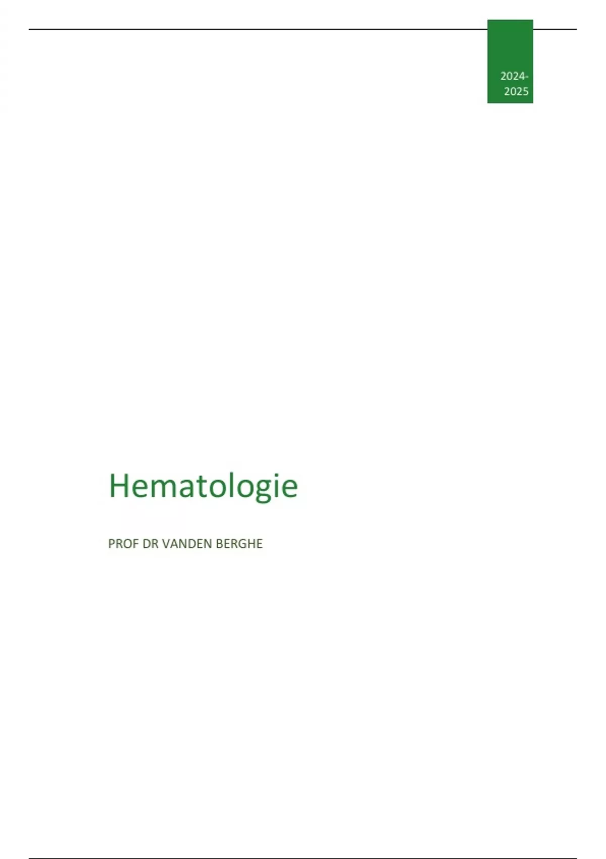 Samenvatting van het vak Hematologie, gegeven aan 1e master GNK KUL door Prof Dr. Vandenberghe. Integratie van slides, lesnotities en handboek met foto's.