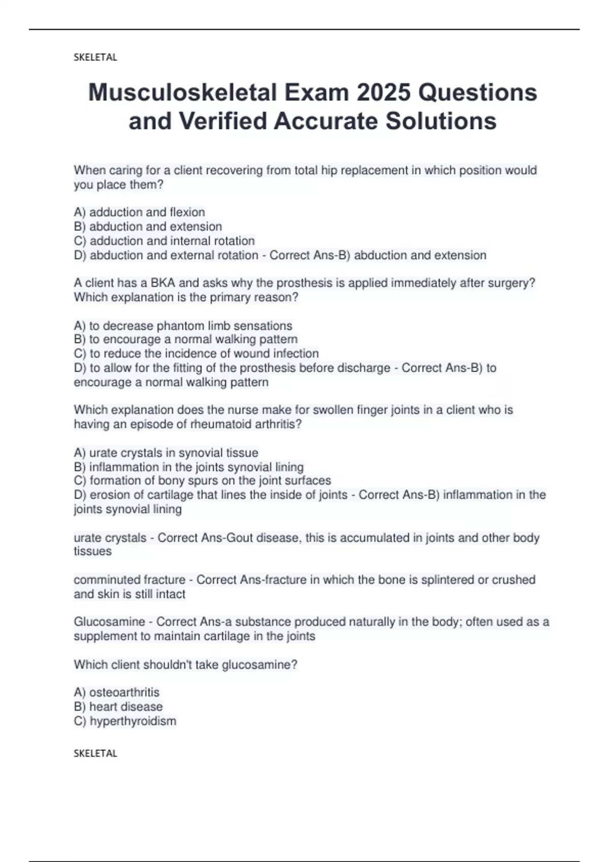 When caring for a client recovering from total hip replacement in which position would you place them? A) adduction and flexion B) abduction and extension C) adduction and internal rotation D) abduction and external rotation - Correct Ans-B) abduction and extension A client has a BKA and asks why the prosthesis is applied immediately after surgery? Which explanation is the primary reason? A) to decrease phantom limb sensations B) to encourage a normal walking pattern C) to reduce the incidence of wound infection D) to allow for the fitting of the prosthesis before discharge - Correct Ans-B) to encourage a normal walking pattern Which explanation does the nurse make for swollen finger joints in a client who is having an episode of rheumatoid arthritis? A) urate crystals in synovial tissue B) inflammation in the joints synovial lining C) formation of bony spurs on the joint surfaces D) erosion of cartilage that lines the inside of joints - Correct Ans-B) inflammation in the joints synovial lining urate crystals - Correct Ans-Gout disease, this is accumulated in joints and other body tissues comminuted fracture - Correct Ans-fracture in which the bone is splintered or crushed and skin is still intact Glucosamine - Correct Ans-a substance produced naturally in the body; often used as a supplement to maintain cartilage in the joints Which client shouldn't take glucosamine? A) osteoarthritis B) heart disease C) hyperthyroidism SKELETAL SKELETAL D) diabetes mellitus - Correct Ans-D) diabetes mellitus bony ankylosis - Correct Ans-abnormal adhesion and rigidity of the bones of the joint, resulting in stiffness and immobility rheumatoid arthritis - Correct Ans-a chronic autoimmune disorder in which the joints and some organs of other body systems are attacked Which site is most common source of major disability from osteoarthritis? A) hip B) knee C) spine D) fingers - Correct Ans-B) knee Which term describes the fracture sustained while a client with osteoporosis was walking up the stairs? A) stress B) pathological C) greenstick D) compound - Correct Ans-B) pathological stress fracture - Correct Ans-a small crack in the bone that often develops from chronic, excessive impact pathological fracture - Correct Ans-break in a bone weakened by some other disease greenstick fracture - Correct Ans-bending and incomplete break of a bone; most often seen in children compound fracture closed - Correct Ans-bone protrudes through skin compound fracture (open) - Correct Ans-bone is broken and a fragment of bone protrudes through an open wound in the skin The five steps of bone healing from fracture - Correct Ans-1. Hematoma formation (72 hours after fracture) 2. Fibrocartilage formation 3. Callus formation (1-4 weeks after fracture) 4. Ossification (permanent bone callus forms) 5. Distance between bone fragment closes hematoma formation - Correct Ans-Torn blood vessels hemorrhage, forming mass of clotted blood called a hematoma Site is swollen, painful, and inflamed SKELETAL SKELETAL Fibrocartilage formation - Correct Ans-3 days to 2 weeks callus formation - Correct Ans-mass of tissue that forms at a fracture site and connects the broken ends of the bone What is callus made of? - Correct Ans-cartilage, osteoblasts, calcium and phosphorus Osteoblasts - Correct Ans-bone forming cells Osteoclasts - Correct Ans-Bone-destroying cells Using a cane - Correct Ans-Flex elbow 30 degrees and hold handle; tip of cane should be 15cm lateral to the base of the 5th toe Hold in hand opposite affected extremity; advance cane and affected leg together; lean on cane when moving good leg UP= cane and good leg DOWN= cane and bad leg Goals of treatment expected in a care plan of a patient with a fracture - Correct Ans Pain relief Intact skin Good skin perfusion Maintenance of mobility Independence with ADL Prevention of complications Conditions that may result in amputation - Correct Ans-Gangrene Arteriosclerosis Diabetes mellitus Chronic osteomyelitis Peripheral vascular disease phantom limb pain - Correct Ans-pain in a limb (or extremity) that has been amputated Burning, stinging or crushing pain nonunion fracture - Correct Ans-break in a bone that has failed to unite and heal after 9 12 months Union fracture - Correct Ans-Bone mends properly Which sign is unique to a fat embolus and would need to be monitored in a client with a distal femoral shaft fracture? A) oliguria B) dyspnea SKELETAL SKELETAL C) petechiae D) confusion - Correct Ans-C) petechiae petechiae - Correct Ans-small, pinpoint hemorrhages purpose of traction - Correct Ans-Reduce muscle spasms Reduce, align, and immobilize fractures Reduce deformity Increase space between opposing forces Chvostek's sign - Correct Ans-Hypocalcemia (facial muscle spasm upon tapping) Hypocalcemia S/S - Correct Ans-C.A.T.S. C - Convulsions A- Arrhythmias T - Tetany (involuntary contraction of muscles) S - Spasms and stridor Drug that is derived from natural source and may be prescribed for treatment of osteoporosis - Correct Ans-Calcitonin Medications for osteoporosis - Correct Ans-*bisphosphonates* - inhibit bone resorption by suppressing osteoclast activity, thus increasing bone density and reducing the incidence of fractures by about 50% *selective estrogen receptor modulators (SERMs):* - bind to estrogen receptors and activate or inhibit them *calcitonin:* - increases bone density and reduces the risk of vertebral fractures Articulation (joint) - Correct Ans-the point at which two bones come together disarticulation amputation - Correct Ans-across a joint such as hip, wrist, elbow, or shoulder; an ankle synovial fluid - Correct Ans-joint-lubricating fluid secreted by the synovial membrane arthrocentesis - Correct Ans-surgical puncture to remove fluid from the joint space risk factors associated with musculoskeletal disorders - Correct Ans-autoimmune disorders calcium deficiency falls hyperuricemia infection SKELETAL SKELETAL medications metabolic disorders neoplastic disorders obesity