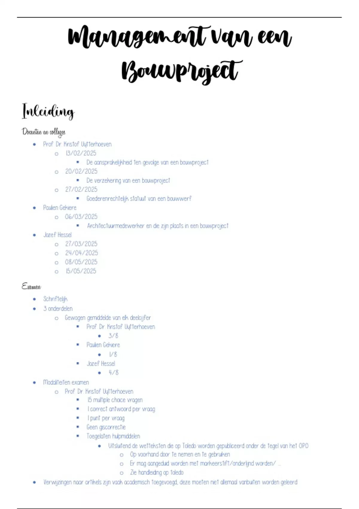 Samenvatting volledige cursus + lesnotities Management van een Bouwproject. Volledig met berekeningen, afbeeldingen en aanduidingen bij belangrijke elementen voor het examen. Semester 2, 2025 door Kristof Uytterhoeven, Paulien Gekiere en Jozef Hessel.