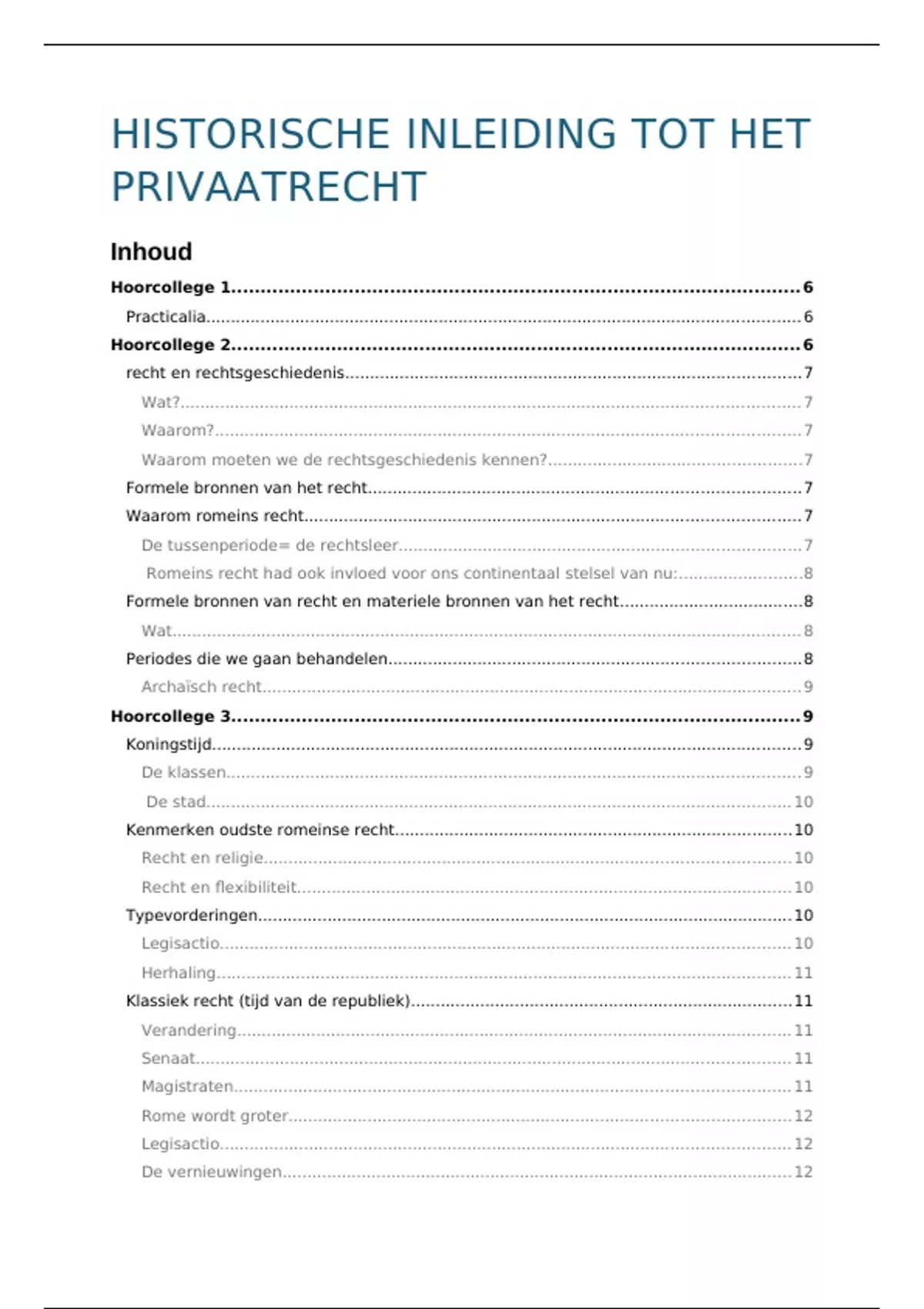 In dit document vind je de lesnotities van het vak Historische inleiding Privaatrecht. Ik heb hierin alle lessen opgenomen en ook alle kennisclips die te kennen waren voor het academiejaar . In de eerste zittijd heb ik een 15/20 gekregen door mijn eigen notities te leren en van hieruit telkens een schema te maken van procedures, huwelijk... doorheen de tijd. Door de lessen te bekijken, merk je direct de rode draad die de prof hanteert en zo kan je ook een mooi resultaat bereiken door op een juiste manier voor te bereiden.
