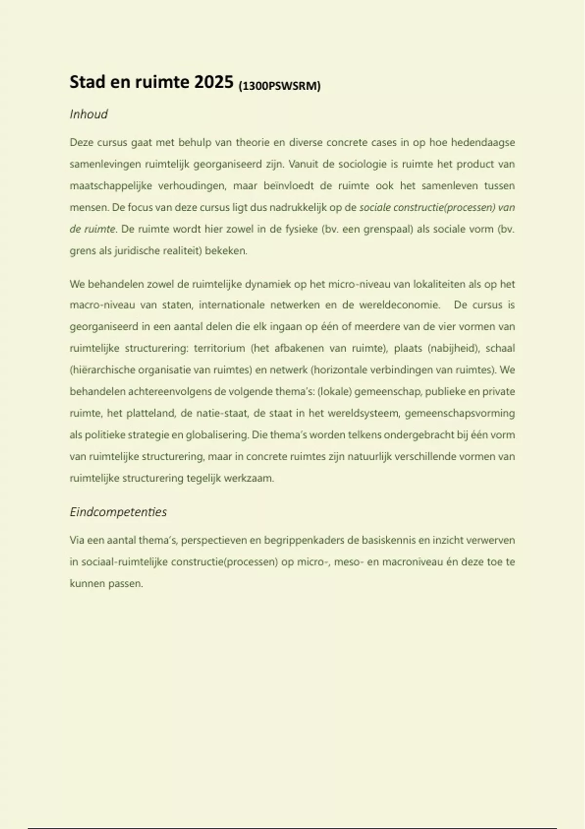 Samenvatting van het vak Stad en ruimte (1300PSWSRM) zoals gedoceerd door Stijn Oosterlynck en Elisabet Van Wymeersch. Inclusief ingevuld voorbeeldexamen. Het document heeft een gele achtergrond met donkergroen lettertype tegen oogvermoeidheid. Veelvuldig gebruik van opsommingspunten, minder gebruik van doorlopende tekst.