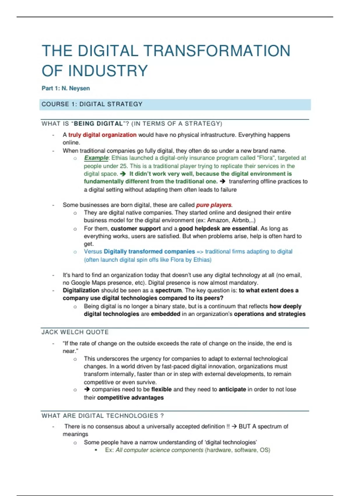 This document contains my notes for the course 'The digital transformation of industry (part of N. Neysen). The notes are written in a clear way that distinguishes the main points from the secondary details. Therefore, it can be used as a summary. Each concept is explained in a straightforward manner, and the sections that are particularly important for the exam are highlighted. Using these notes, I achieved a score of 19/20