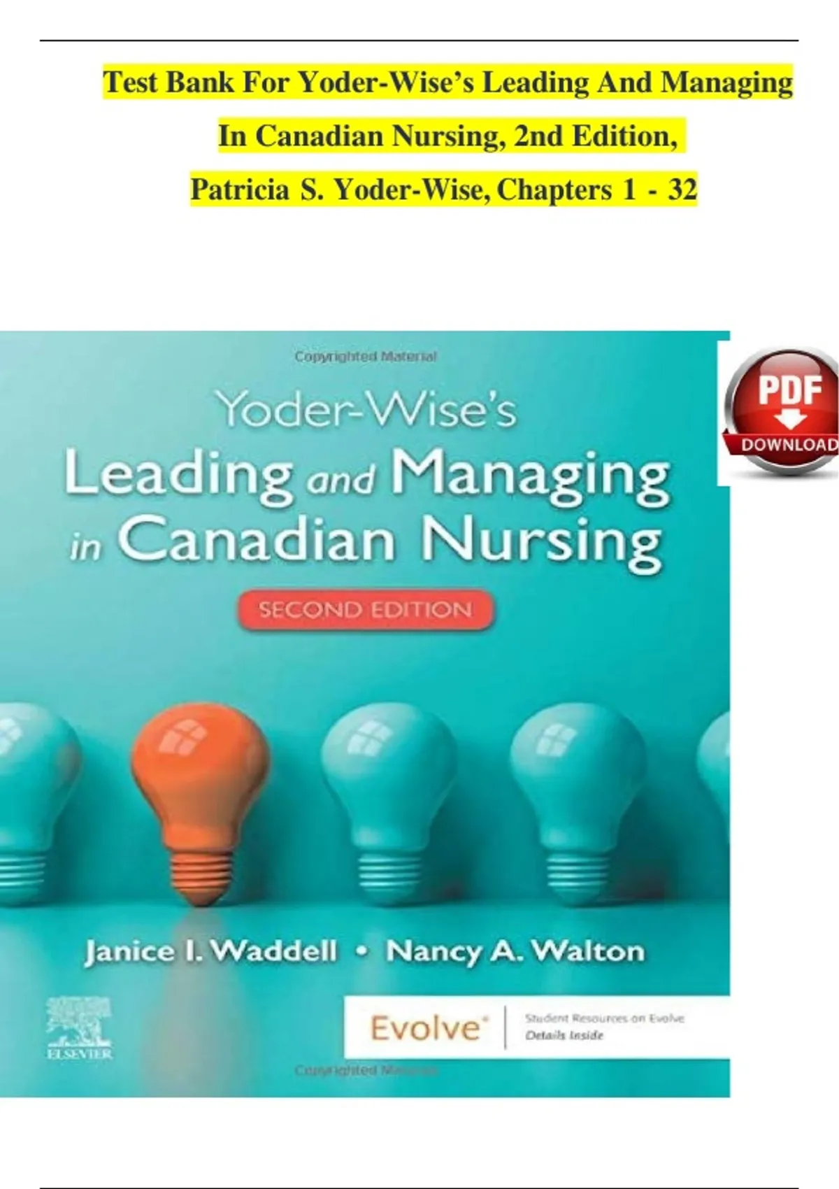 Test Bank For Yoder-Wise’s Leading And Managing In Canadian Nursing, 2nd Edition, Patricia S. Yoder-Wise, Chapters 1 - 32 TEST BANK FOR YODER-WISE’S LEADING AND MANAGING IN CANADIAN NURSING, 2ND EDITION, PATRICIA S. YODER-WISE, JANICE WADDELL, NANCY WALTON, ISBN: 9781771721684, ISBN: 9781771721745, ISBN: 9781771721677 Table of Contents Part I: Core Concepts Overview 1. Leading, Managing, and Following 2. Developing the Role of Leader 3. Developing the Role of Manager 4. Nursing Leadership and Indigenous Health 5. Patient Focus Context 6. Ethical Issues 7. Legal Issues 8. Making Decisions and Solving Problems 9. Health Care Organizations 10. Understanding and Designing Organizational Structures 11. Cultural Diversity in Health Care 12. Power, Politics, and Influence Part II: Managing Resources 13. Caring, Communicating, and Managing with Technology 14. Managing Costs and Budgets 15. Care Delivery Strategies 16. Staffing and Scheduling (available only on Evolve) 17. Selecting, Developing, and Evaluating Staff (available only on Evolve) Part III: Changing the Status Quo 18. Strategic Planning, Goal-Setting, and Marketing 19. Nurses Leading Change: A Relational Emancipatory Framework for Health and Social Action 20. Building Teams Through Communication and Partnerships 21. Collective Nursing Advocacy 22. Understanding Quality, Risk, and Safety 23. Translating Research into Practice Part IV: Interpersonal and Personal Skills Interpersonal 24. Understanding and Resolving Conflict 25. Managing Personal/Personnel Problems 26. Workplace Violence and Incivility 27. Inter and Intraprofessional Practice and Leading in Professional Practice Settings Personal 28. Role Transition 29. Self-Management: Stress and Time Future 30. Thriving for the Future 31. Leading and Managing Your Career 32. Nursing Students as Leaders