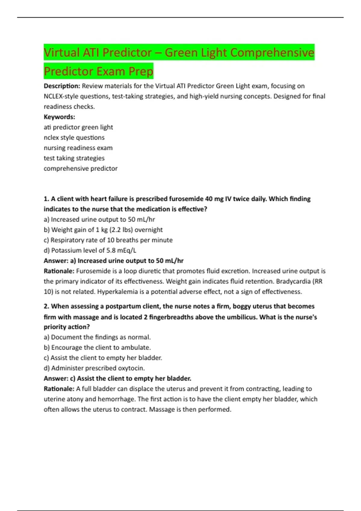 Description: Review materials for the Virtual ATI Predictor Green Light exam, focusing on