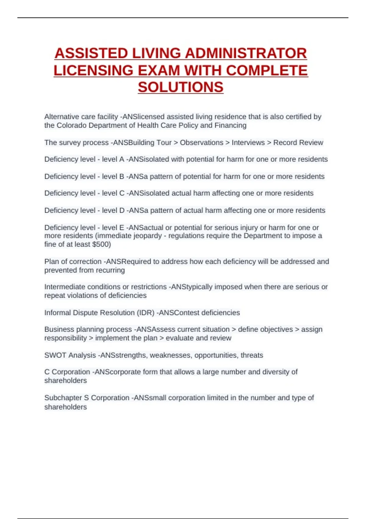Plan of correction -ANSRequired to address how each deficiency will be addressed and