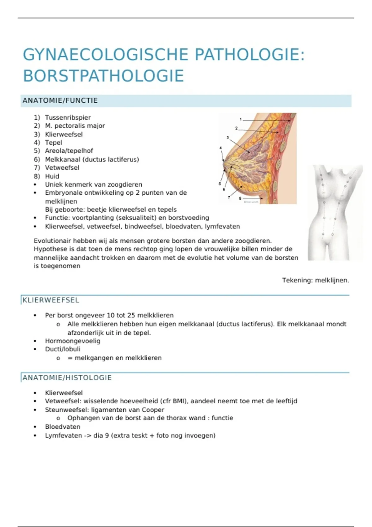 Dit is een samenvatting van het vak algemene pathologie, onderdeel gynaecologische pathologie. Deze samenvatting bevat het deel borstpathologie. De lessen zijn gegeven in .