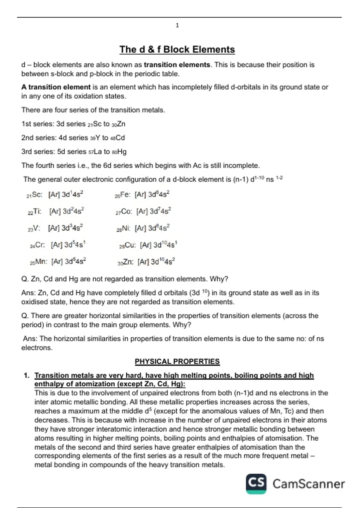 This provides a detailed explanation of the chapter on the D and F block elements. It have question with an answer.
