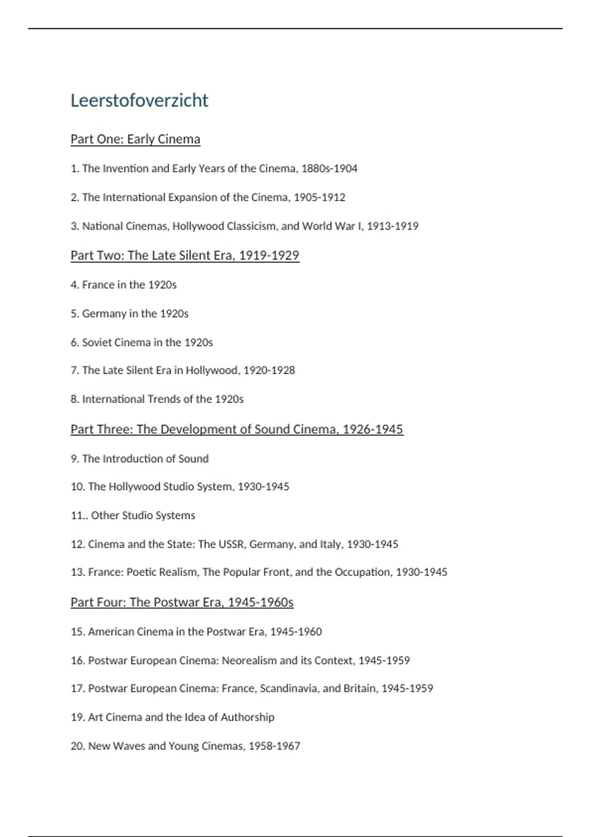 Dit document bevat een uitgebreide samenvatting van alle lesnotities die horen bij de PowerPoints van het vak Filmgeschiedenis aan de KU Leuven, gegeven door Prof. Roel Vande Winkel. In deze samenvatting staat zo goed als alle informatie die in de lessen gegeven werd ter verduidelijking en aanvulling van de leerstof op de PowerPoints.