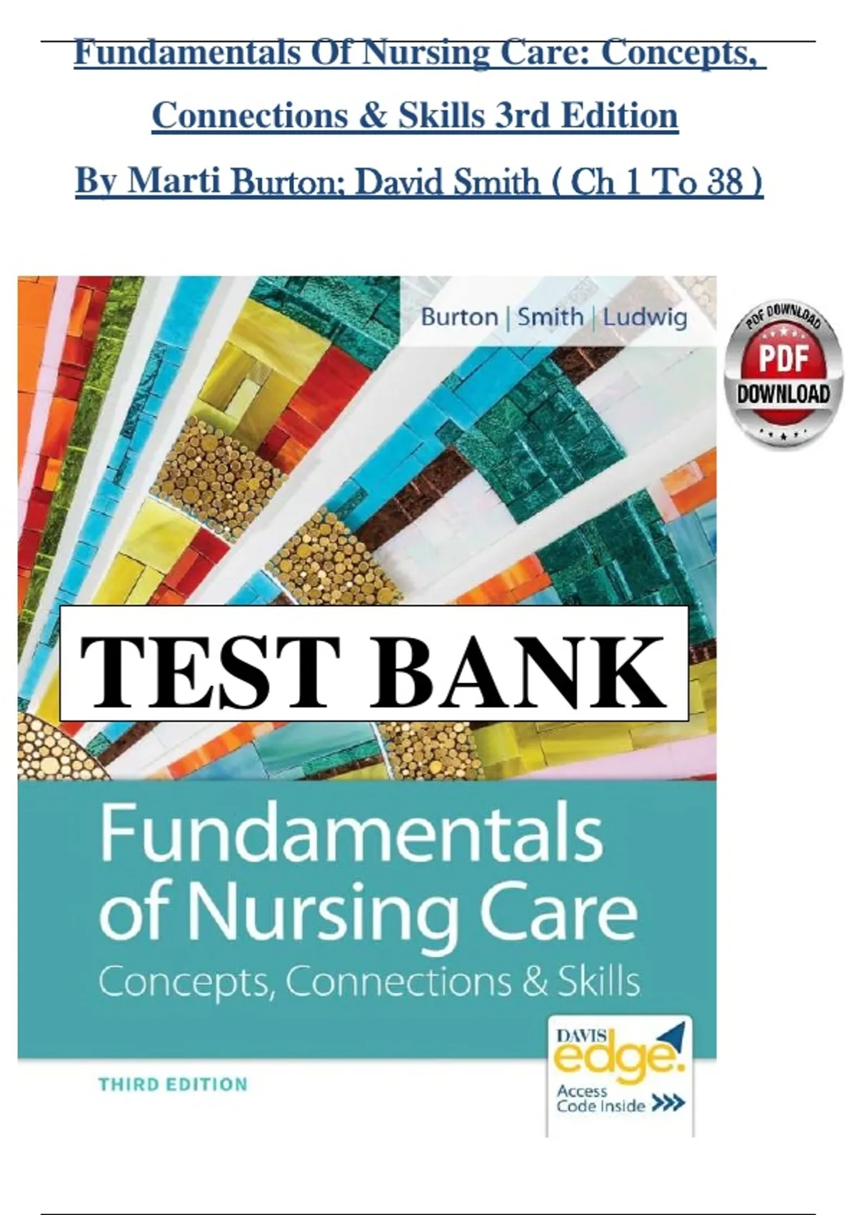 Unlock the ultimate study resource for nursing students with the Fundamentals of Nursing Concepts, Connections & Skills Care 3rd Edition Test Bank by Marti Burton. This comprehensive guide spans all 38 chapters, covering core nursing principles, clinical skills, patient care strategies, and evidence-based practices. Perfect for exam preparation, NCLEX review, and class assessments, it offers detailed questions, answers, and rationales to reinforce learning and boost confidence. A must-have resource for students seeking mastery in fundamentals of nursing, critical thinking, and practical application in healthcare settings.