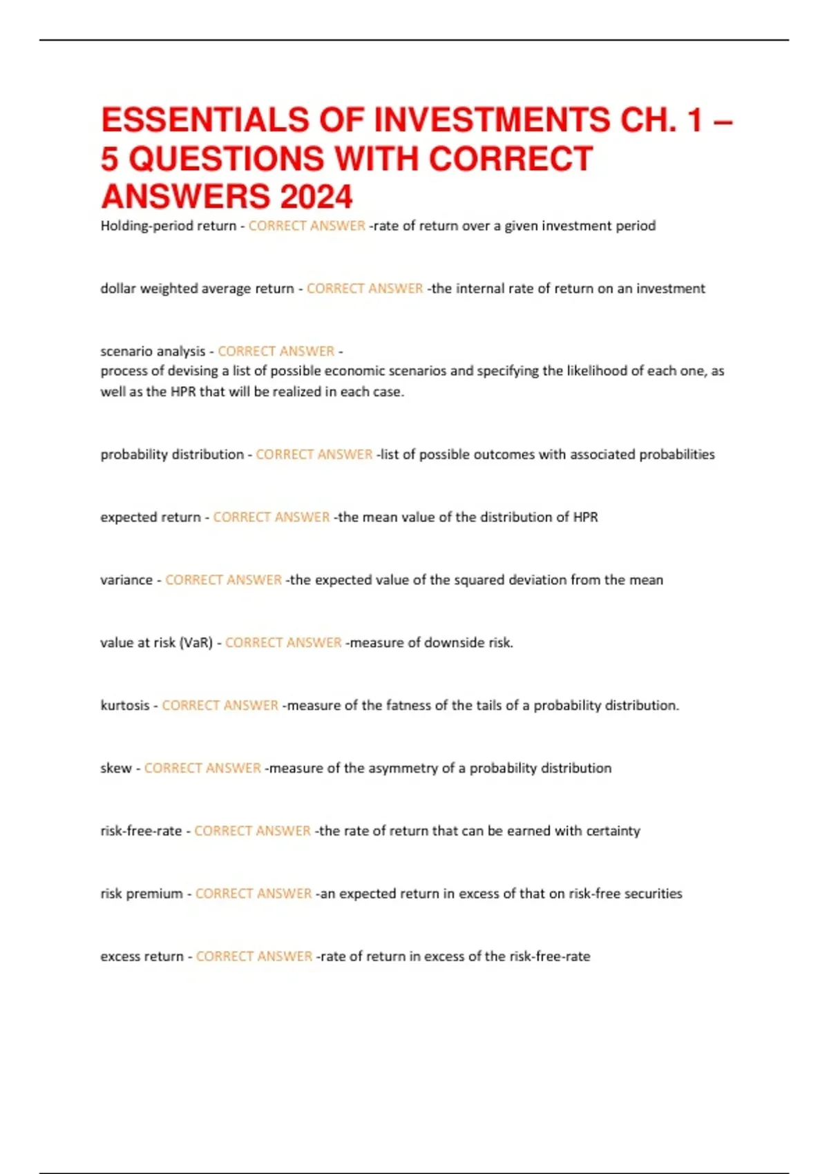 Holding-period return - CORRECT ANSWER -rate of return over a given investment period dollar weighted average return - CORRECT ANSWER -the internal rate of return on an investment scenario analysis - CORRECT ANSWER - process of devising a list of possible economic scenarios and specifying the likelihood of each one, as well as the HPR that will be realized in each case. probability distribution - CORRECT ANSWER -list of possible outcomes with associated probabilities expected return - CORRECT ANSWER -the mean value of the distribution of HPR variance - CORRECT ANSWER -the expected value of the squared deviation from the mean value at risk (VaR) - CORRECT ANSWER -measure of downside risk. kurtosis - CORRECT ANSWER -measure of the fatness of the tails of a probability distributio