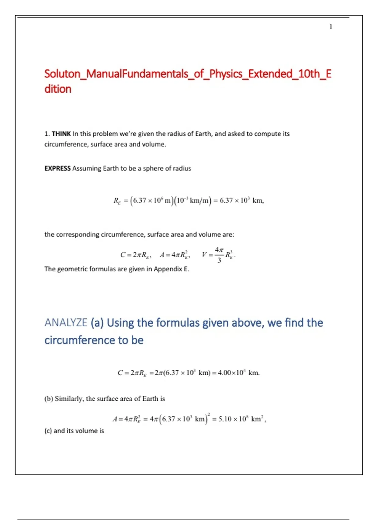 1. THINK In this problem we’re given the radius of Earth, and asked to compute its