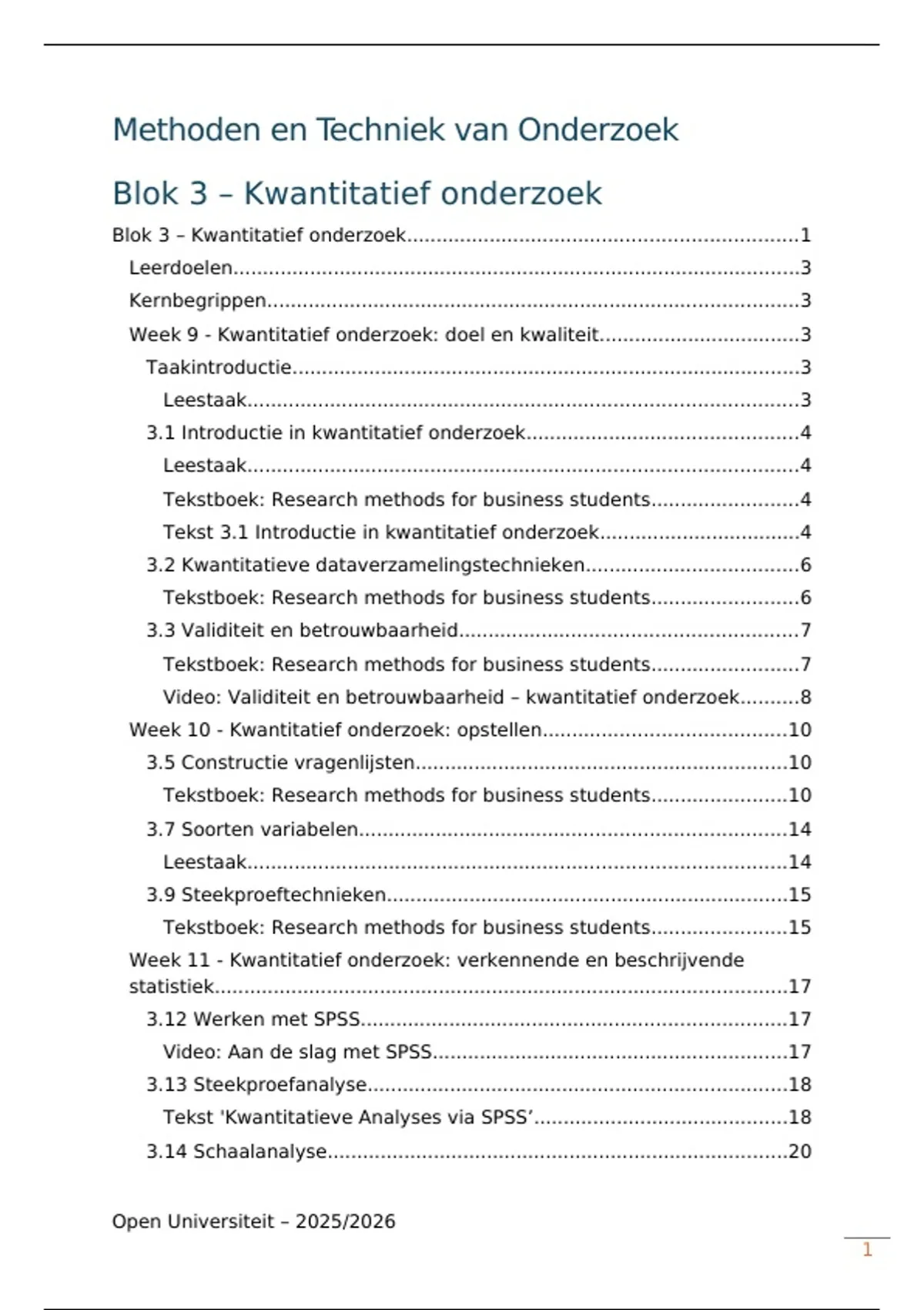 Dit document is een samenvatting van alle readerteksten, video's, de Handleiding SPSS van Blok 3 en onderdelen van het boek Saunders et al. (9e editie) van Blok 3 - Week 9 t/m week 12. Waarin de volgende kernbegrippen centraal staan: - kwantitatieve onderzoeksstrategie: survey, experiment, archief onderzoek - maatregelen borging constructvaliditeit, interne validiteit, externe validiteit en betrouwbaarheid in kwantitatief onderzoek - secundaire en primaire data - soorten vragenlijsten - opbouw vragenlijst - pilot testing - soorten variabelen: nominaal, ordinaal, interval en ratio - beschrijvingsmaten - steekproeftechniek: probability sampling - hercoderen van items en variabelen - betrouwbaarheidsanalyse via Cronbachs alfa - factoranalyse - correlatieanalyse - enkelvoudige en meervoudige regressieanalyse - multicollineariteit.