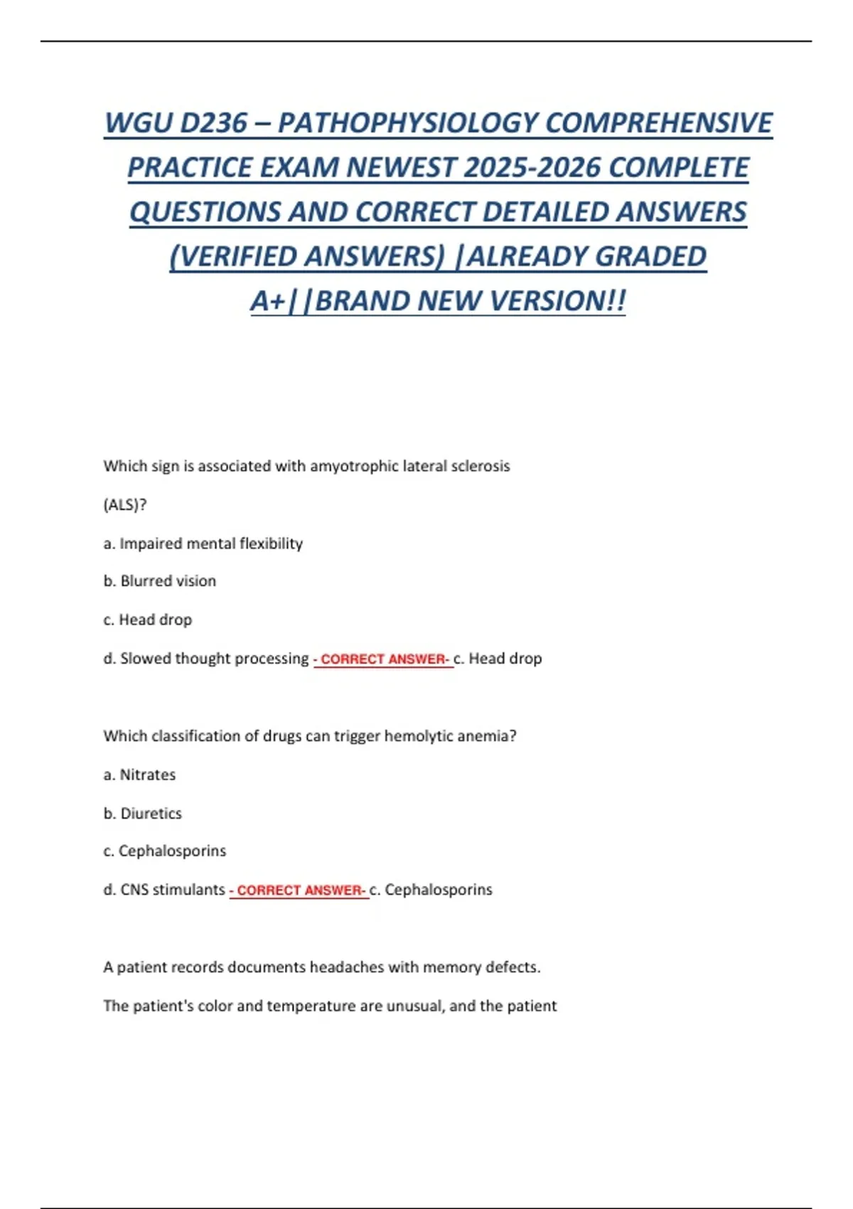 Prepare for the WGU D236 Pathophysiology Comprehensive Exam with this all-in-one practice guide. Covers high-yield topics including disease processes, cellular and systemic pathophysiology, organ system disorders, clinical manifestations, diagnostic testing, and treatment principles. Includes realistic practice questions, verified answers, and detailed rationales to strengthen critical thinking, clinical reasoning, and exam readiness. Ideal for WGU nursing students seeking mastery and confidence in Pathophysiology.
