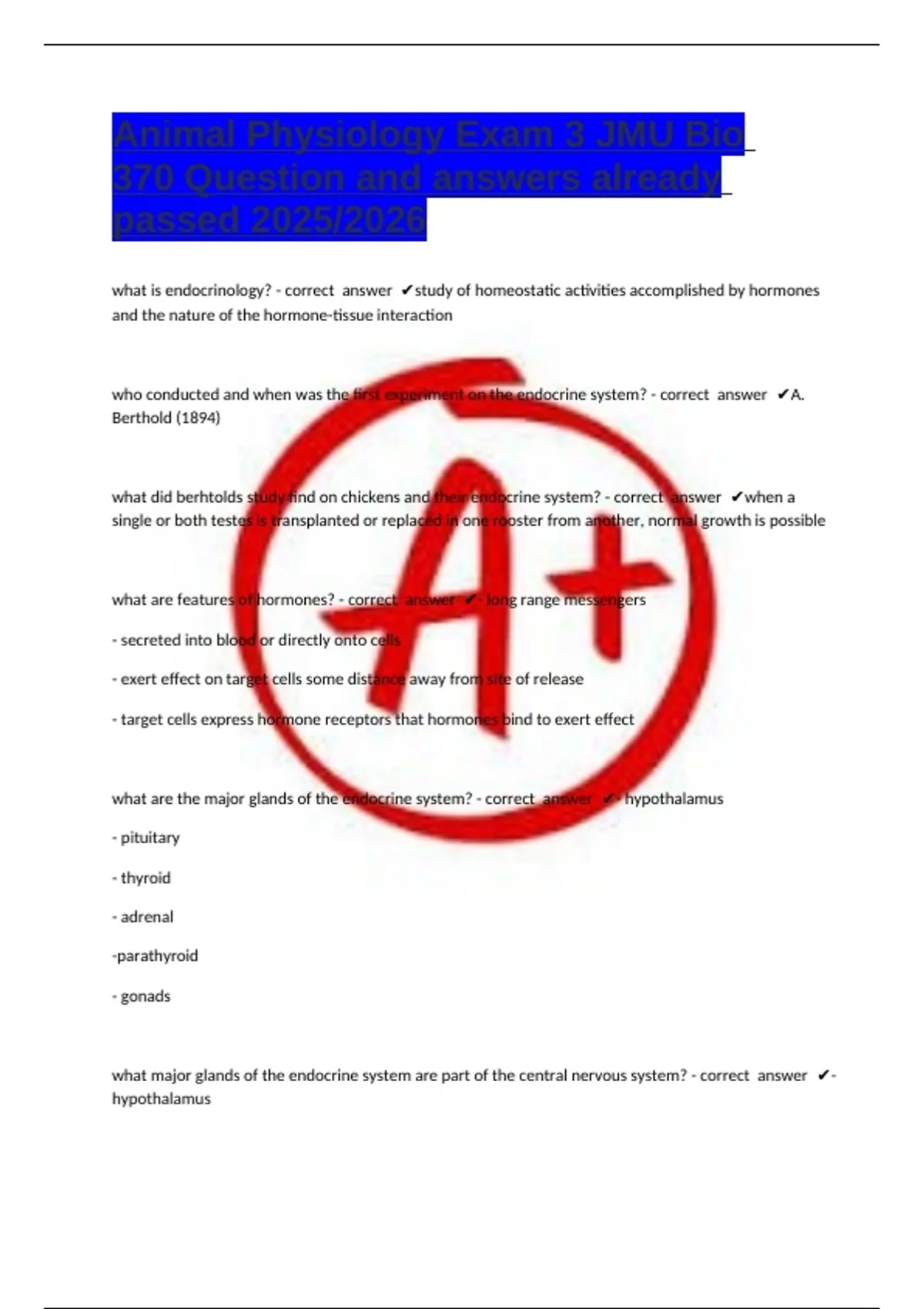 who conducted and when was the first experiment on the endocrine system? - correct answer ✔A.
