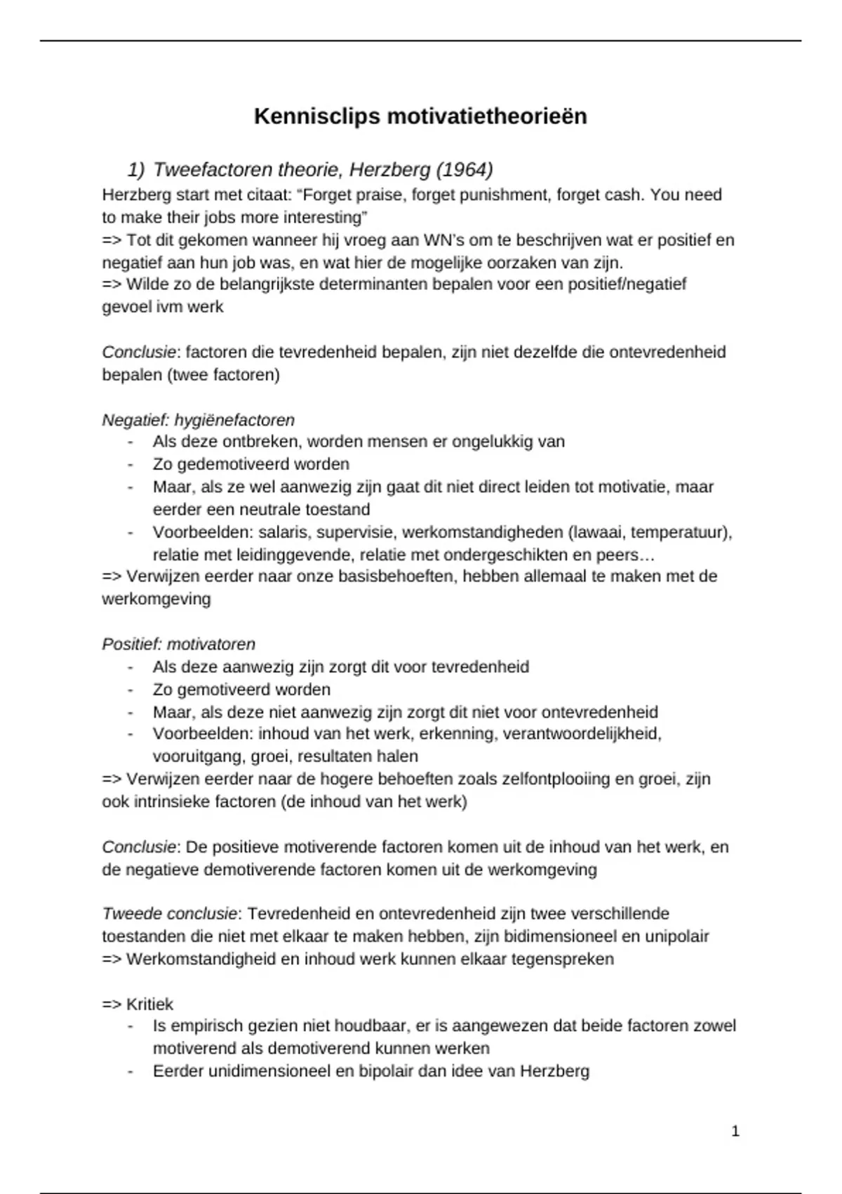 Document met een duidelijk overzicht en samenvatting van de te kennen motivatietheorieen voor het examen.