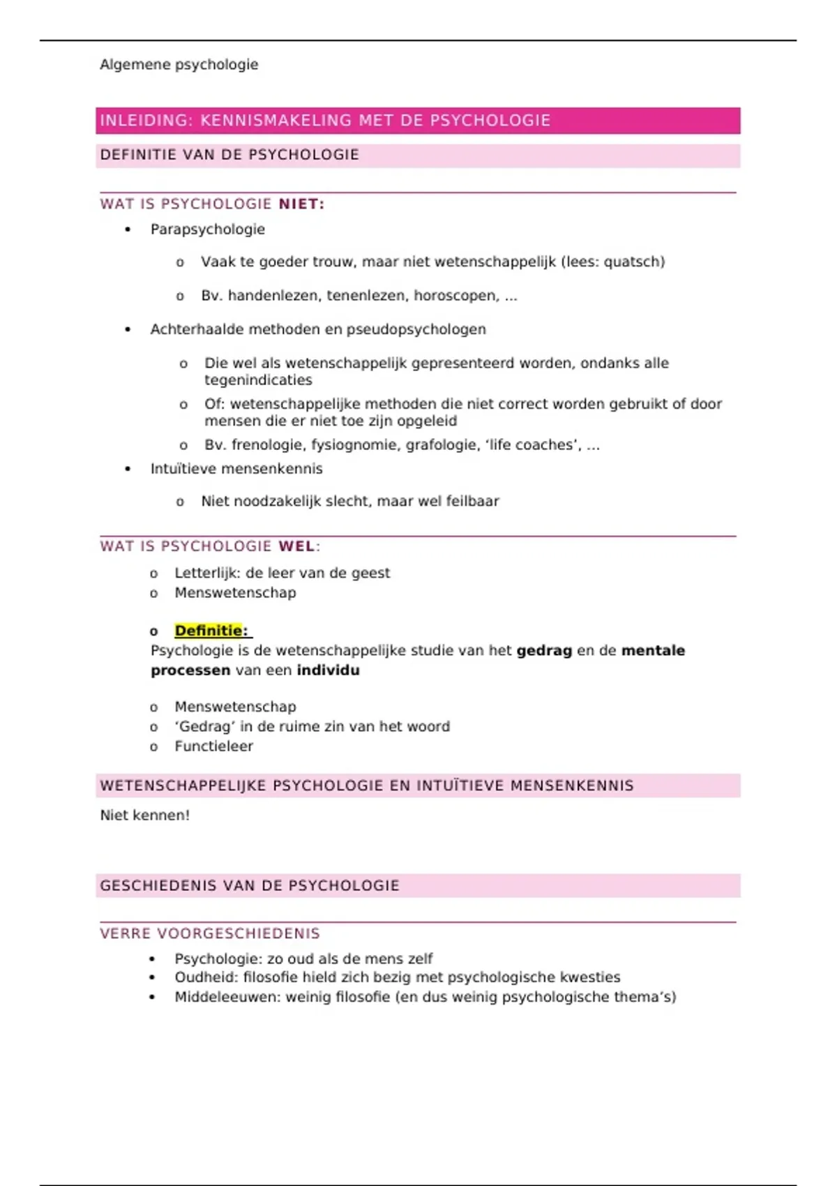 Dit document biedt een overzichtelijke samenvatting van de inleiding tot de algemene psychologie. Het behandelt wat psychologie wel en niet is, inclusief definities, misvattingen en een onderscheid tussen wetenschap en pseudowetenschap. Daarnaast worden de belangrijkste psychologische stromingen historisch toegelicht, van rationalisme en empirisme tot behaviorisme, gestaltpsychologie, psychoanalyse, humanistische psychologie en hedendaagse cognitieve en positieve psychologie. Het document vormt een duidelijk en gestructureerd geheel dat ideaal is als instapmateriaal voor studenten psychologie.