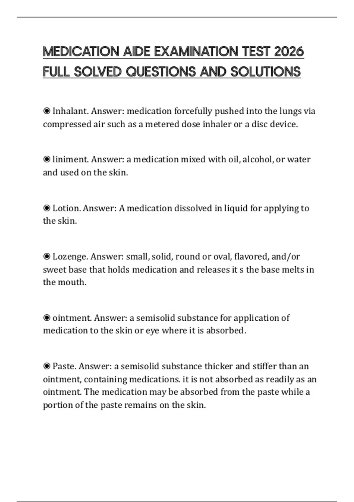 ◉ Lotion. Answer: A medication dissolved in liquid for applying to