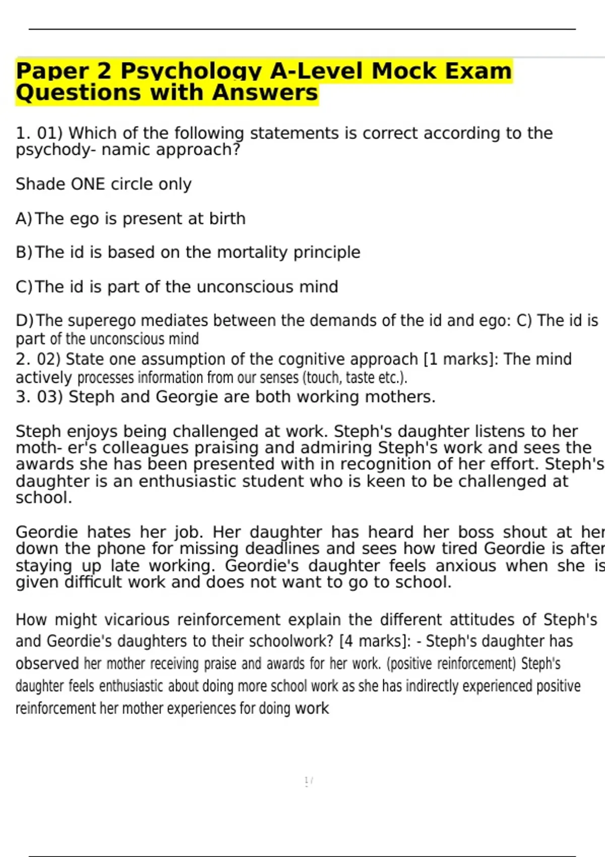 Paper 2 Psychology A-Level Mock Exam Questions with Answers