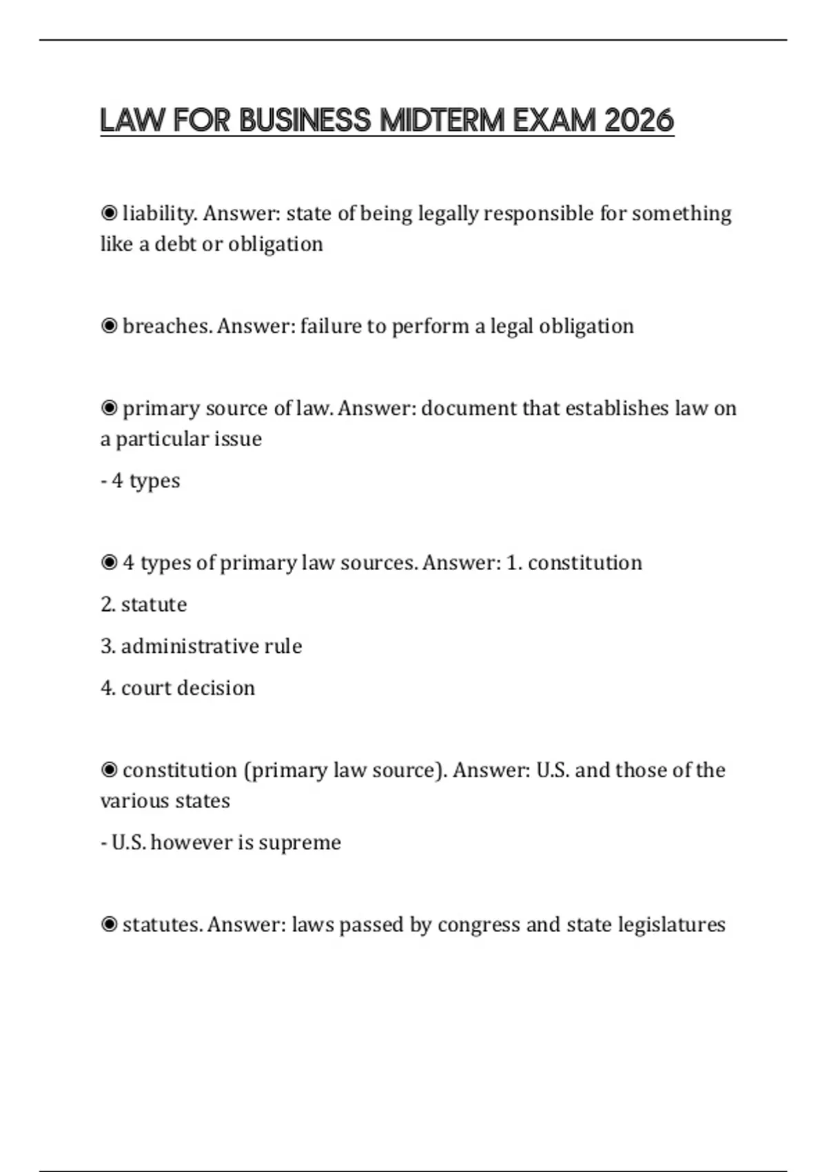 ◉ 4 types of primary law sources. Answer: 1. constitution