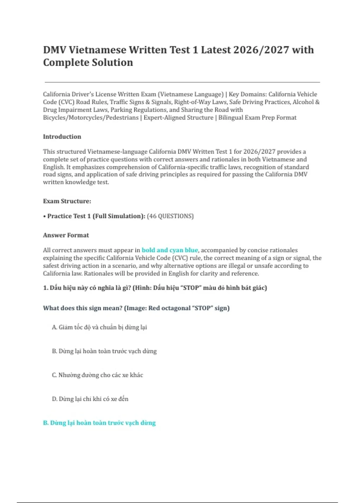 This structured Vietnamese-language California DMV Written Test 1 for 2026/2027 provides a