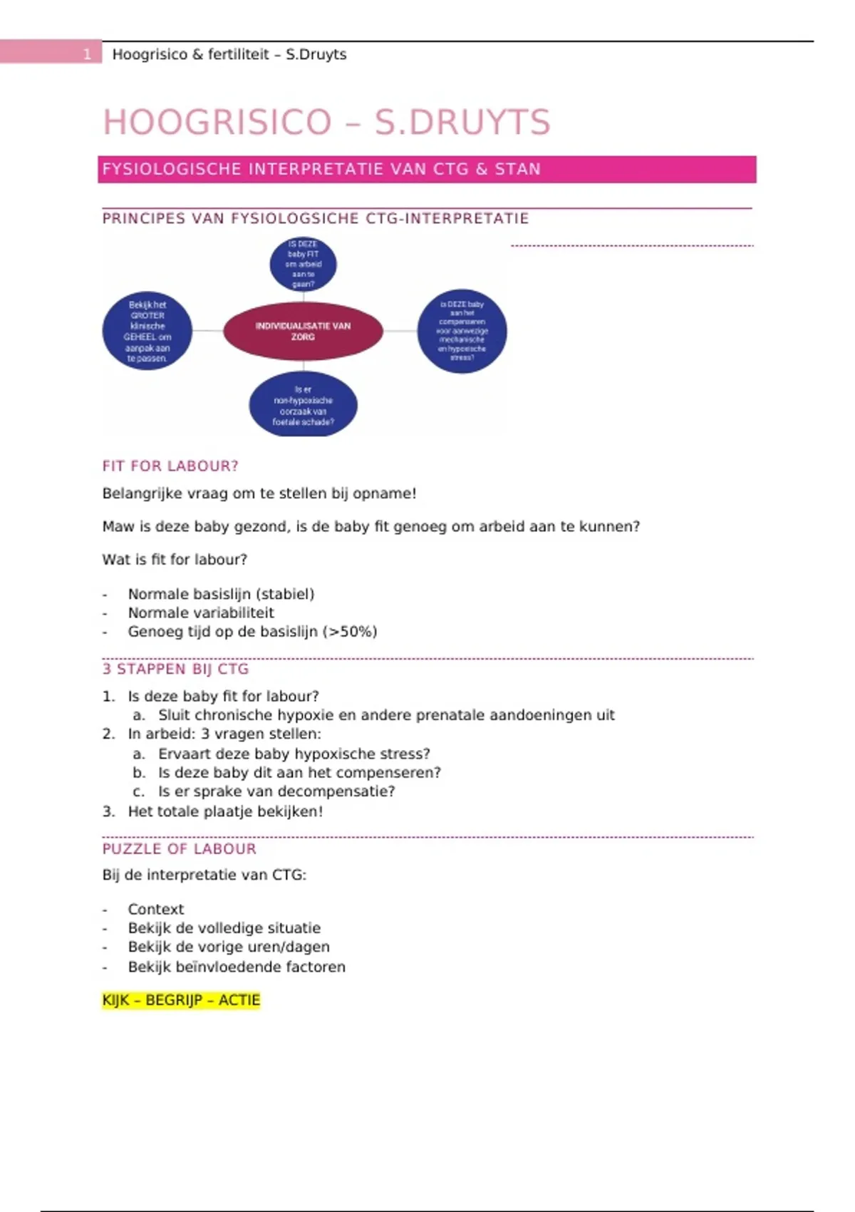 Samenvatting van Fysiologische interpretatie van CTG & STAN dat wordt gegeven door S.Druyts in het 3de jaar vroedkunde aan de UCLL