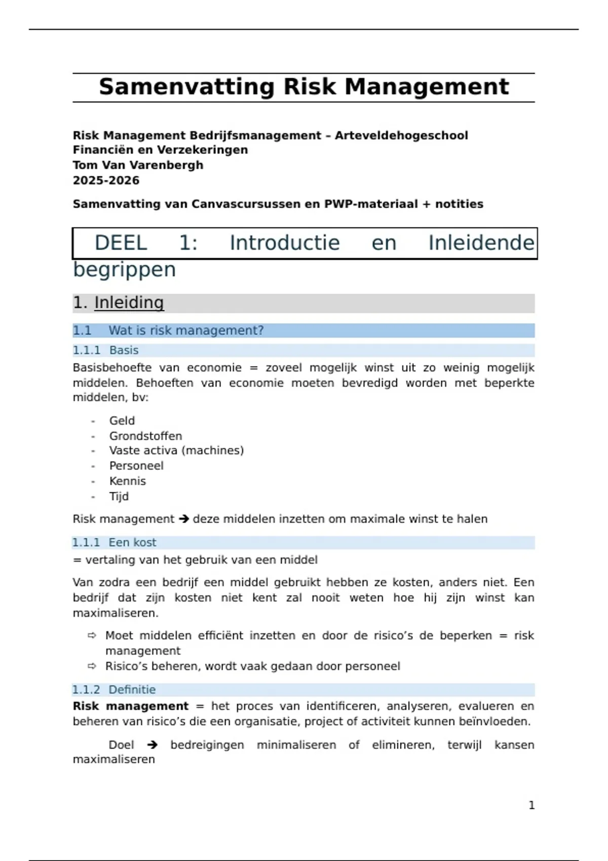 Risk Management Bedrijfsmanagement – Arteveldehogeschool