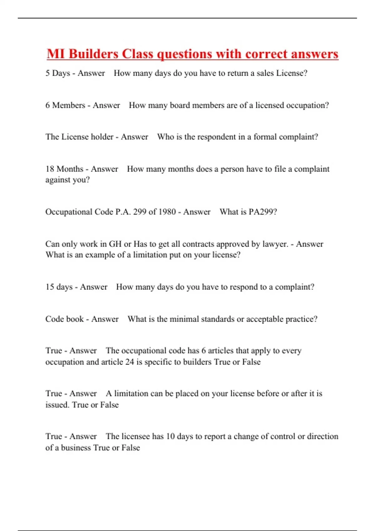 Michigan Builders Business/Law/Accounting questions with correct answers