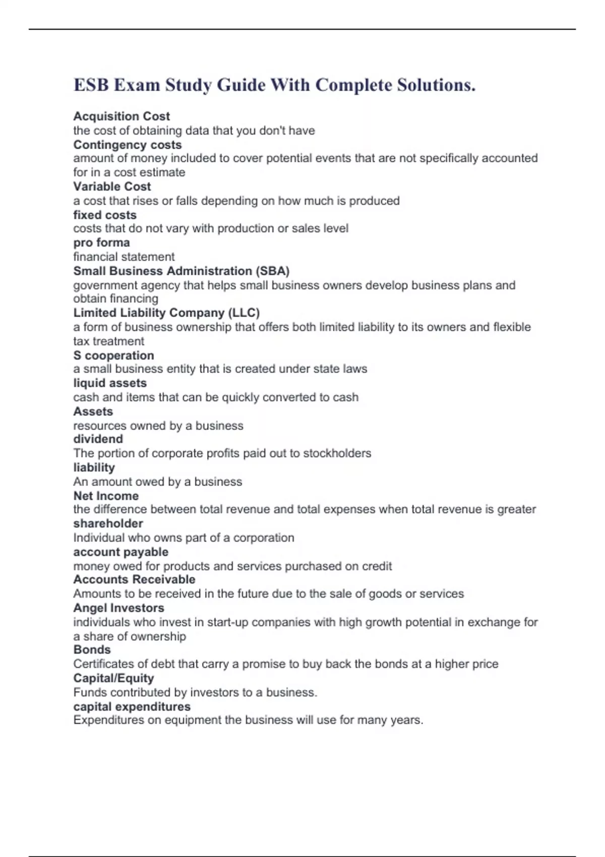 ESB Exam Study Guide With Complete Solutions. ESB EXAM Study Guide(Complete)2022/2023 ESB Certification Test With Complete Solutions. ESB(Answers for ESB Practice Test Entrepreneurship & Small Business v.2 - U.S. Practice Exam 1 Training)Questions And Answers. ESB V2 Certification Questions With Correct Answers. ESB V.2 EXAM 2 SOLVED 100% CORRECT!!
