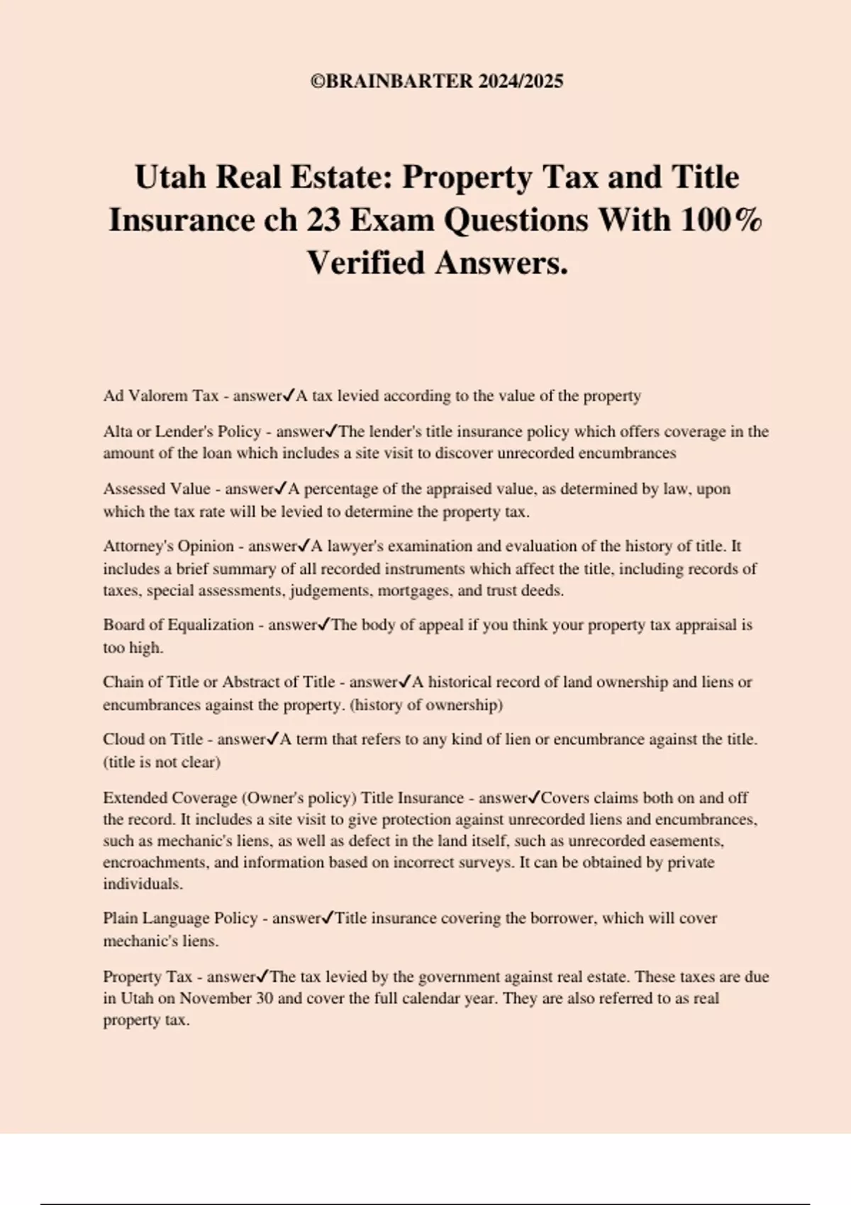 Utah Real Estate: Property Tax and Title Insurance ch 23 Exam Questions With 100% Verified Answers.