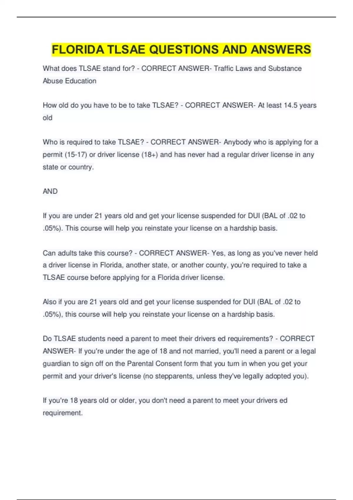 PACKAGE::TLSAE EXAM BUNDLE (GRADED (A+) CONSISTS OF: FLORIDA TLSAE QUESTIONS AND ANSWERS TLSAE COURSE FINAL EXAM (FLORIDA) TLSAE FINAL EXAM ANSWERS TLSAE COURSE FINAL EXAM QUESTIONS AND ANSWERS