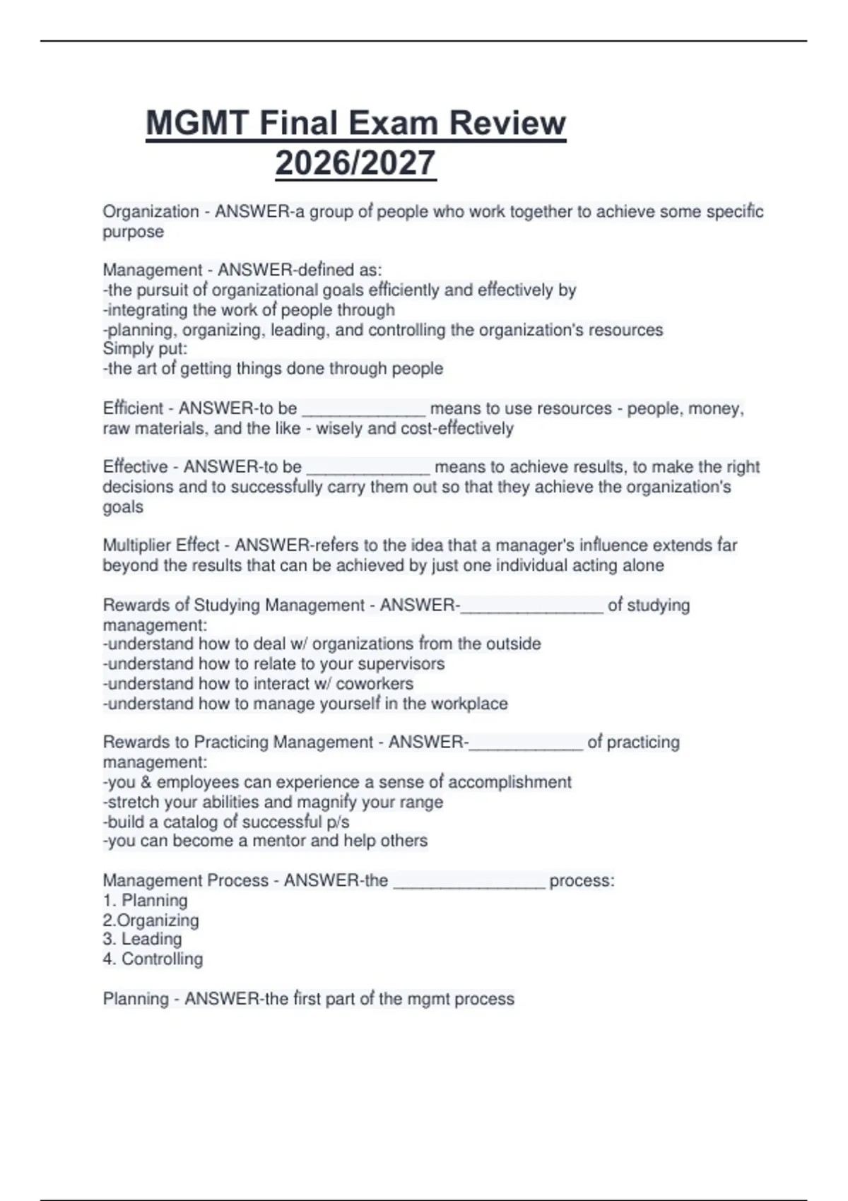 MGMT Final Exam Review 2026/2027 MGMT 2100 Exam Questions And Answers 2026/2027 MGMT 425 Complete Exam Questions And Correct Answers 2026/2027 MGMT 371 Written Exam Questions And Verified Answers 2026/2027 MGMT 340 Study Guide Questions And Accurate Answers 2026/2027 MGMT 335 Exam Review Questions And 100% Correct Answers 2026/2027 2026/2027 MGMT E
