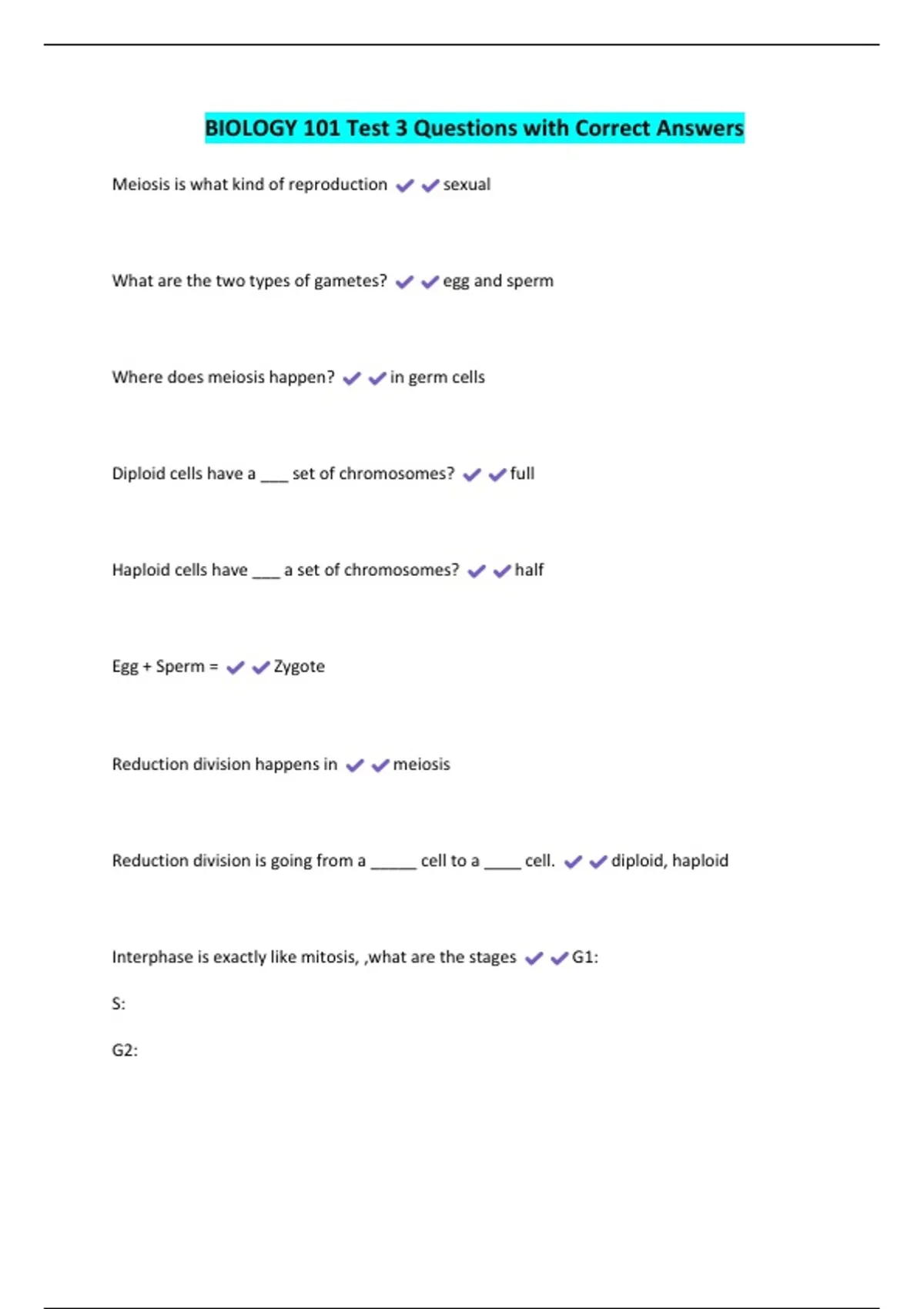 BIOLOGY 101 Test 3 Questions with Correct Answers 2 Exam (elaborations) Biology 101 Exam Questions with Correct Answers 3 Exam (elaborations) Biology 101 Exam Questions with Correct Answers 4 Exam (elaborations) Biology 101, Exam 2 Questions and Answers