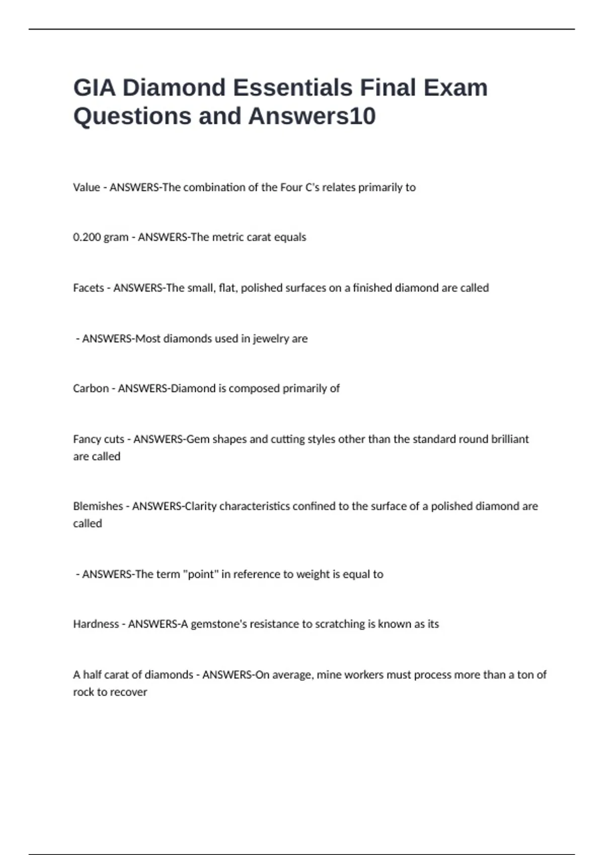 GIA Diamonds and Diamond Grading Final Exam Questions and Answers