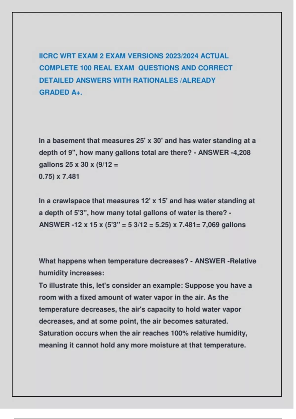 IICRC WRT & ASD EXAM 2025/2026 IICRC WRT EXAM 2025/2026 IICRC WRT 2025 UPDATE LATEST EXAM VERSION | 200 MOST TESTED QUESTIONS WITH VERIFIED ANSWERS GRADED A+ IICRC WRT 2025 UPDATE EXAM 2 LATEST VERSIONS (VERSION A & B) IICRC WRT EXAM 2 EXAM VERSIONS 2023/2024 IICRC WRT EXAM, MOST RECENT EXAM 2026 ACTUAL COMPLETE REAL EXAM QUESTIONS